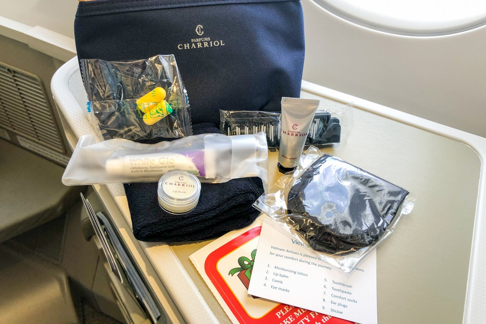 Each passenger in the business-class cabin received a Parfums Charriol amenity kit. The kit was made from a navy fabric with a brown zipper, which looked quite sharp. Inside the kit was a standard offering of eye mask, earplugs, hairbrush, dental kit, lip balm, socks and lotion.