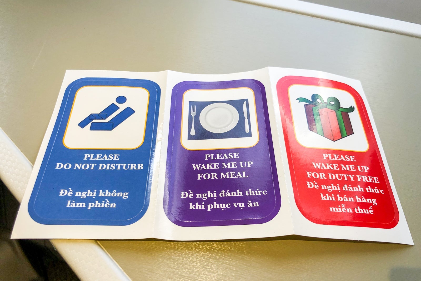 The kit also included a set of stickers to let the cabin crew know whether or not you wanted to be awakened for meal service or duty-free sales, plus the classic "Please Do Not Disturb." I love it when airlines offer these stickers, because it prevents situations where a crew member wakes up a passenger who wants to continue sleeping or fails to wake up someone who wants service. It's a simple solution, and one that I hope more airlines adopt.