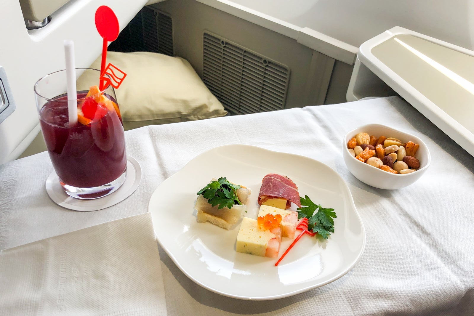 The airline offered three signature cocktails: the High Mountain, made with red wine and rum; the whiskey-based Huế and the Southern Land, made with whiskey and Campari. With my appetizer, I ordered a High Mountain, which was refreshing, with apple and orange notes.