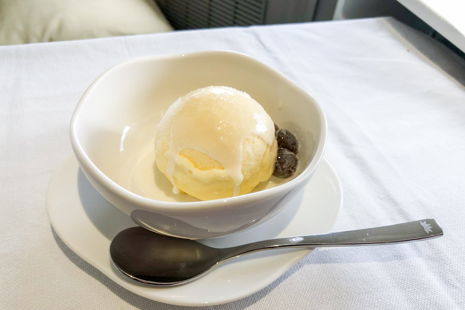 When I ordered my main course, I followed the recommendation of the flight attendant, who said the chicken was the best. Other offerings included grilled filet of beef with sauce and glass noodles, and the Japanese main selections of pork with pepper sauce and steamed rice or grilled flounder with nanban and steamed rice.