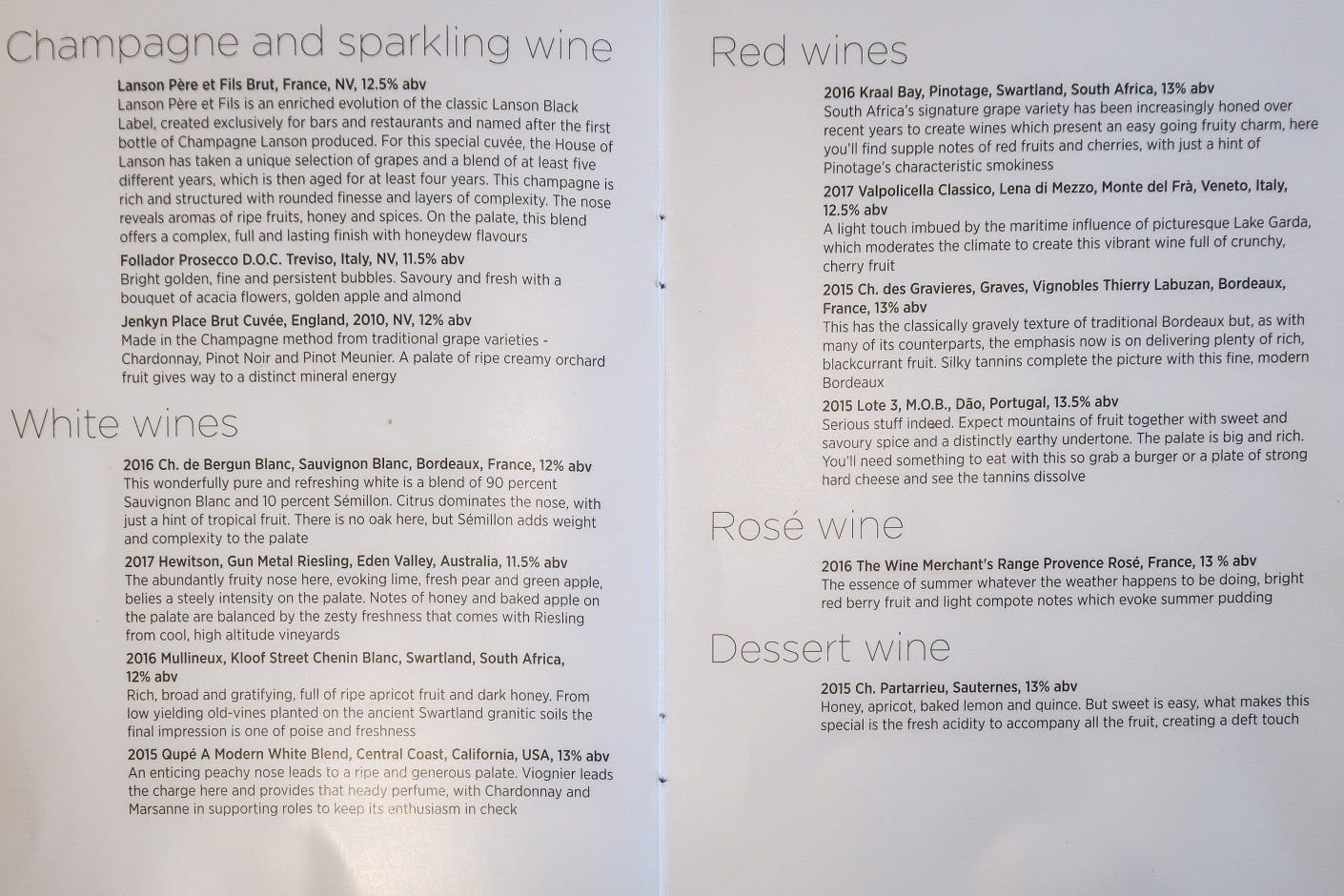 Onboard food was good, but the lack of menus was a one-off blip and spoiled the experience more than I would have expected (I was surprised to learn how much I am influenced by reading a fancy description of the food I am about to eat!).