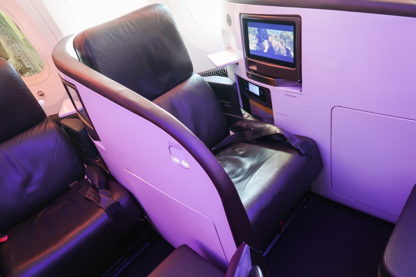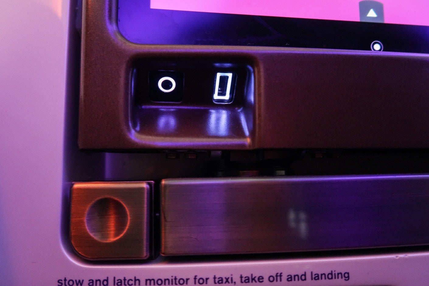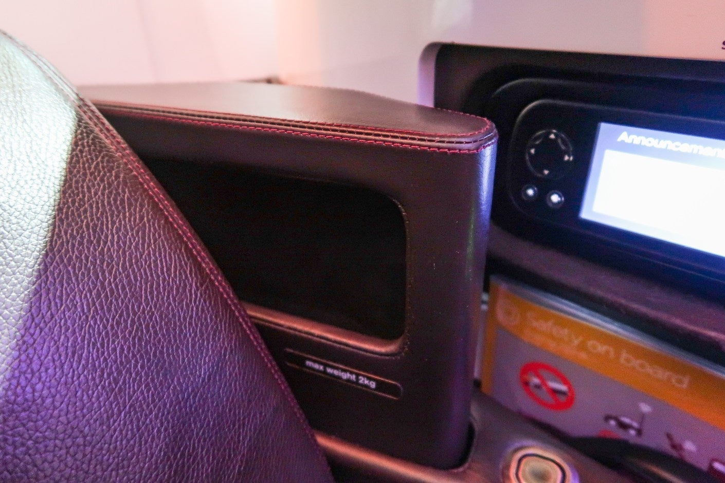 The seats had a relatively small IFE screen compared to other products, a power outlet and USB socket. a small cocktail table and larger table for eating and working.
