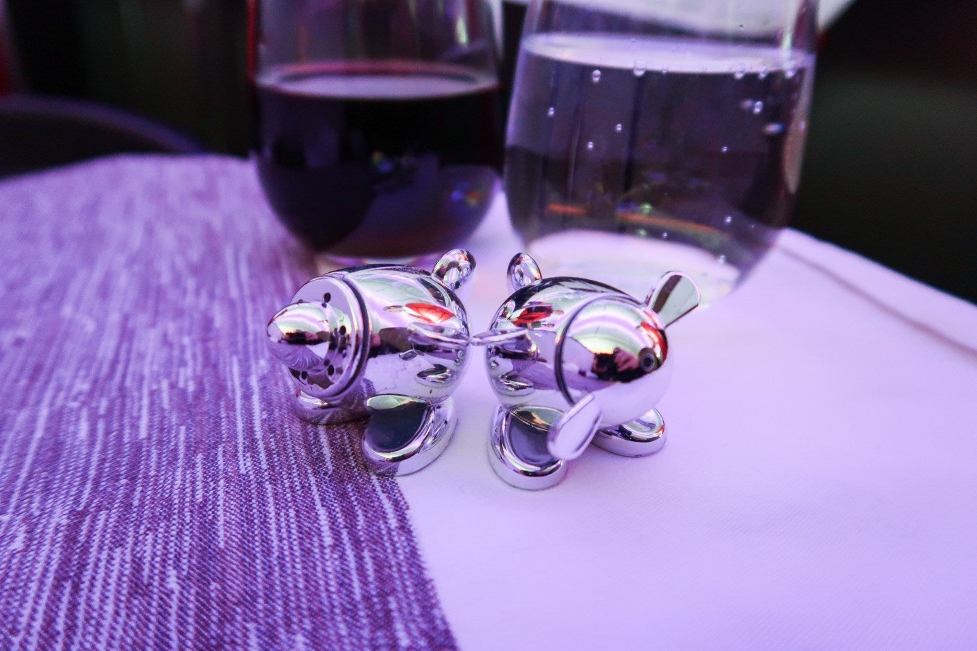 Then, the drinks cart was pushed down the cabin, and the lack of menu meant I took a stab at the wine based on their basic explanations. The Argentinian malbec was nice, though! As these drinks were served, the crew also popped down the cute Wilbur and Orville salt and pepper shakers.