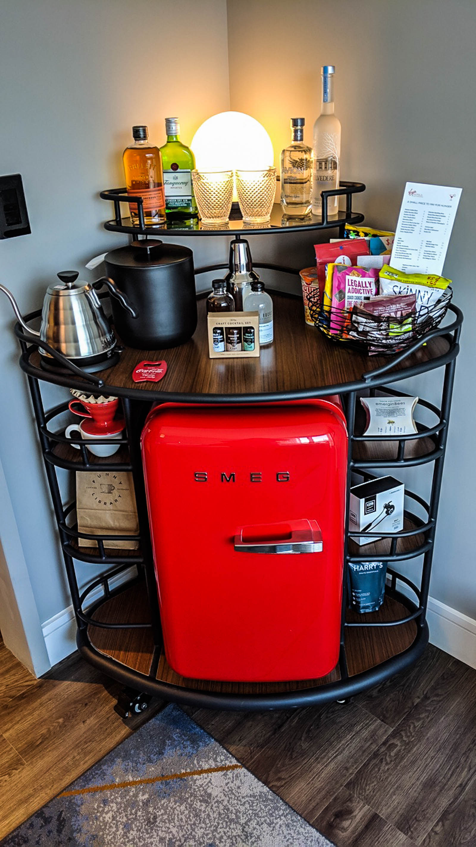 In the main bedroom itself, there was a well-stocked minibar with a tiny Smeg retro fridge that could be customized to include beloved treats, if you requested it via the Virgin Hotel brand's loyalty program, The Know, beforehand. I forgot my login and had a bear of a time recovering the password because I never received any emails for a password reset. I could have created a new account, but the customization process was long (even though fun), and the truth is I simply forgot to come back and fiddle more with the site later on.