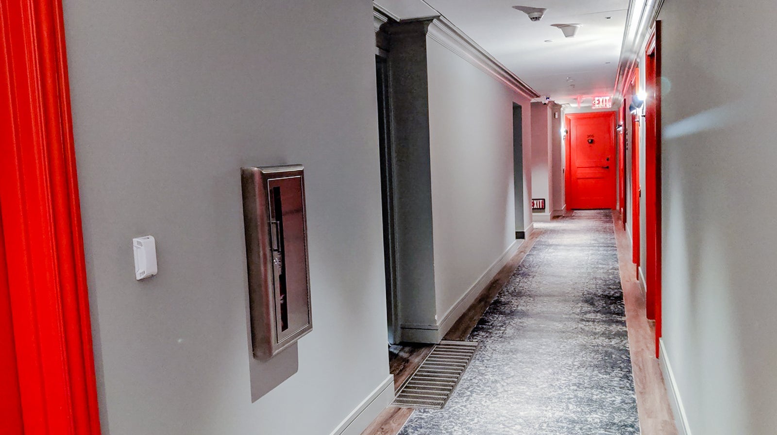 You needed to swipe your hotel key across a sensor to operate the elevator unless you were trying to access the rooftop bar. The hallways were a crisp white with bold red accents -- you'd be hard-pressed to forget that you were in a Virgin property here. Each room had a little doorbell ringed with red, for a touch of analog whimsy amidst all the technology.