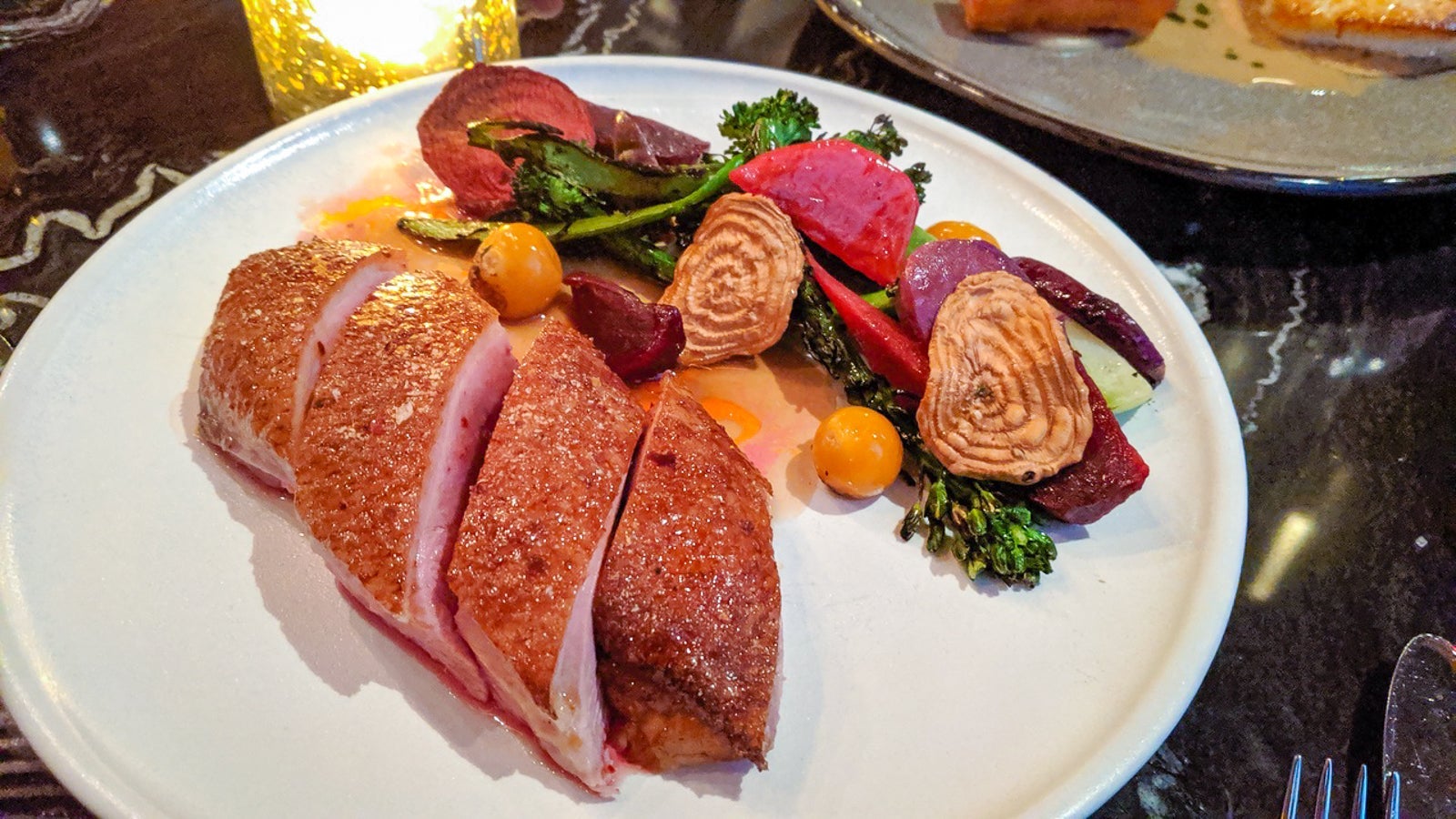 I hadn't thought to call ahead for dinner reservations to the Commons Club, but I should have — I couldn't get a same-day dinner reservation at check-in, even as a hotel guest. However, the host said I could sit in the Shag Room and order off of the same menu there. This turned out to be a great idea, and we ended up eating there for an hour and a half.