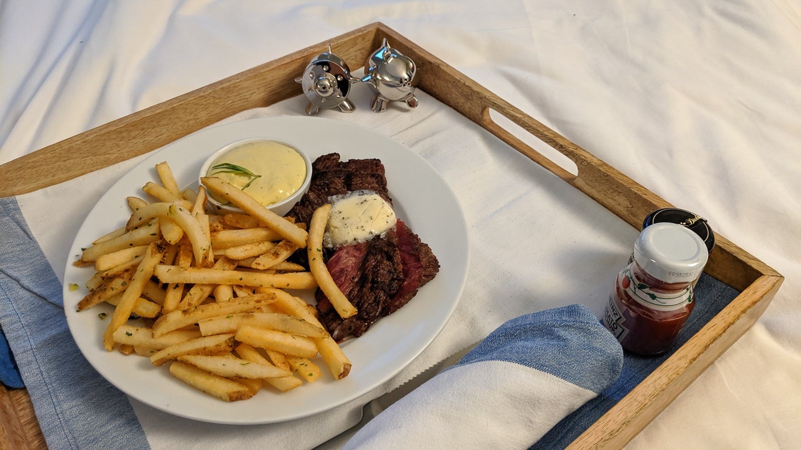 We got back late that evening and decided to check out the room service. We flicked on the in-room TV at the foot at the bed and scrolled through the menu, deciding on steak frites with gremolata and Béarnaise. Unfortunately, you couldn't order directly from the TV menu, so I picked up the phone around 11:30pm. Our food was delivered exactly 23 minutes later — not at all bad for a busy Saturday evening toward kitchen closing time. I was impressed that the steak wasn't overcooked, too.