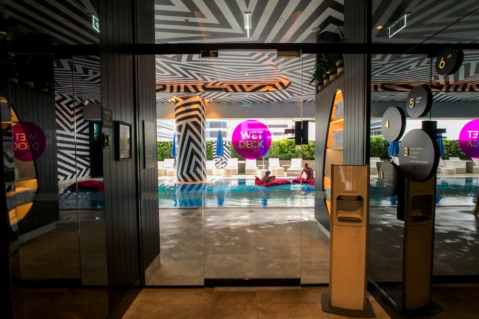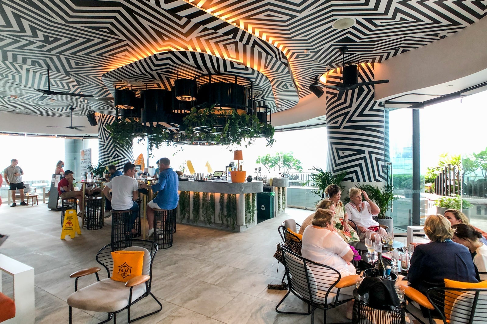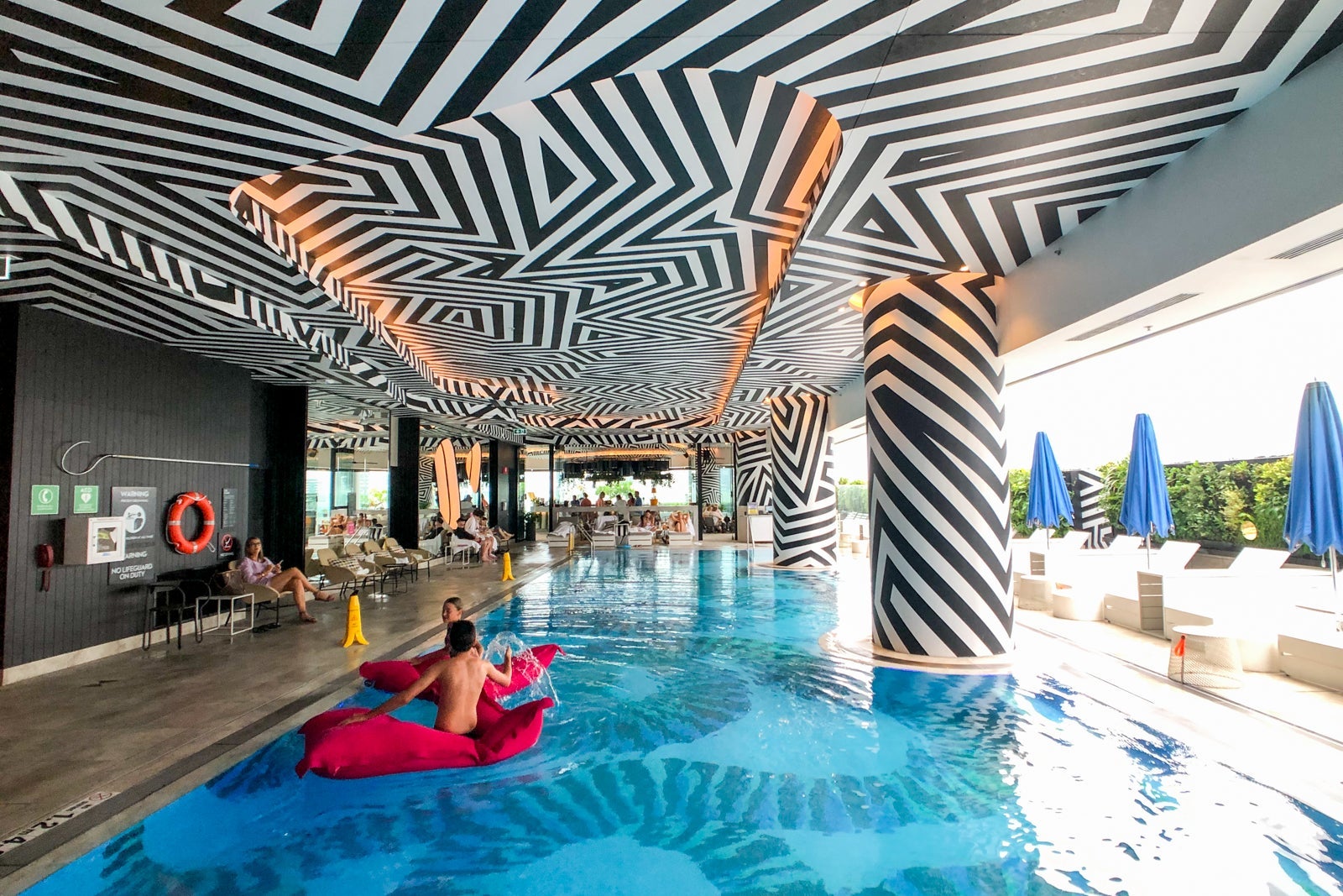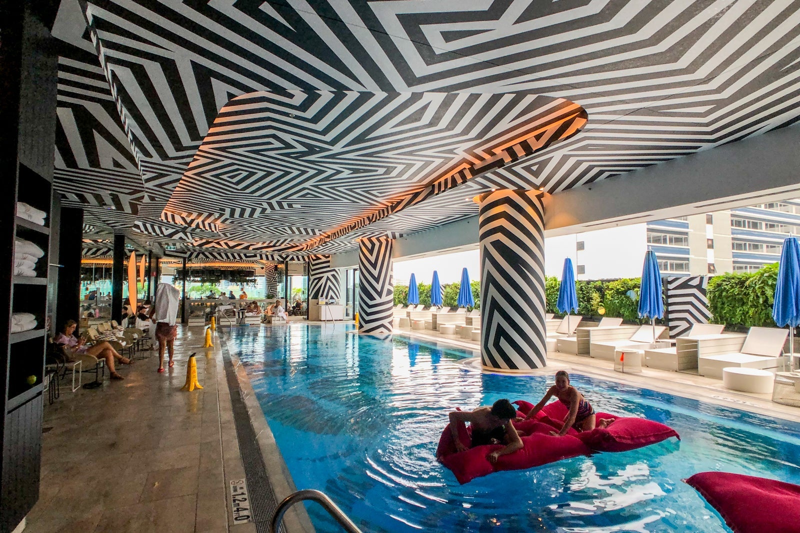The hotel's pool, located on the fourth floor, is Instagram-famous thanks to its zebra-like striped columns and ceiling and its clubby indoor-outdoor ambiance. The outdoor section wasn't much in use thanks to the rain showers, but plenty of guests and family groups seemed to be enjoying the covered lounges and the pool itself.