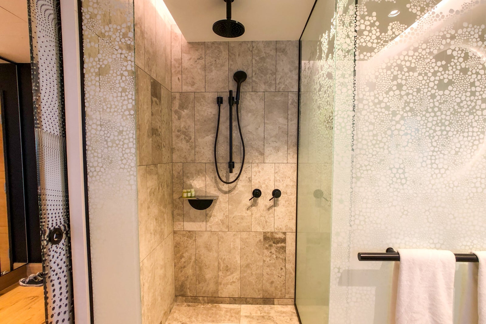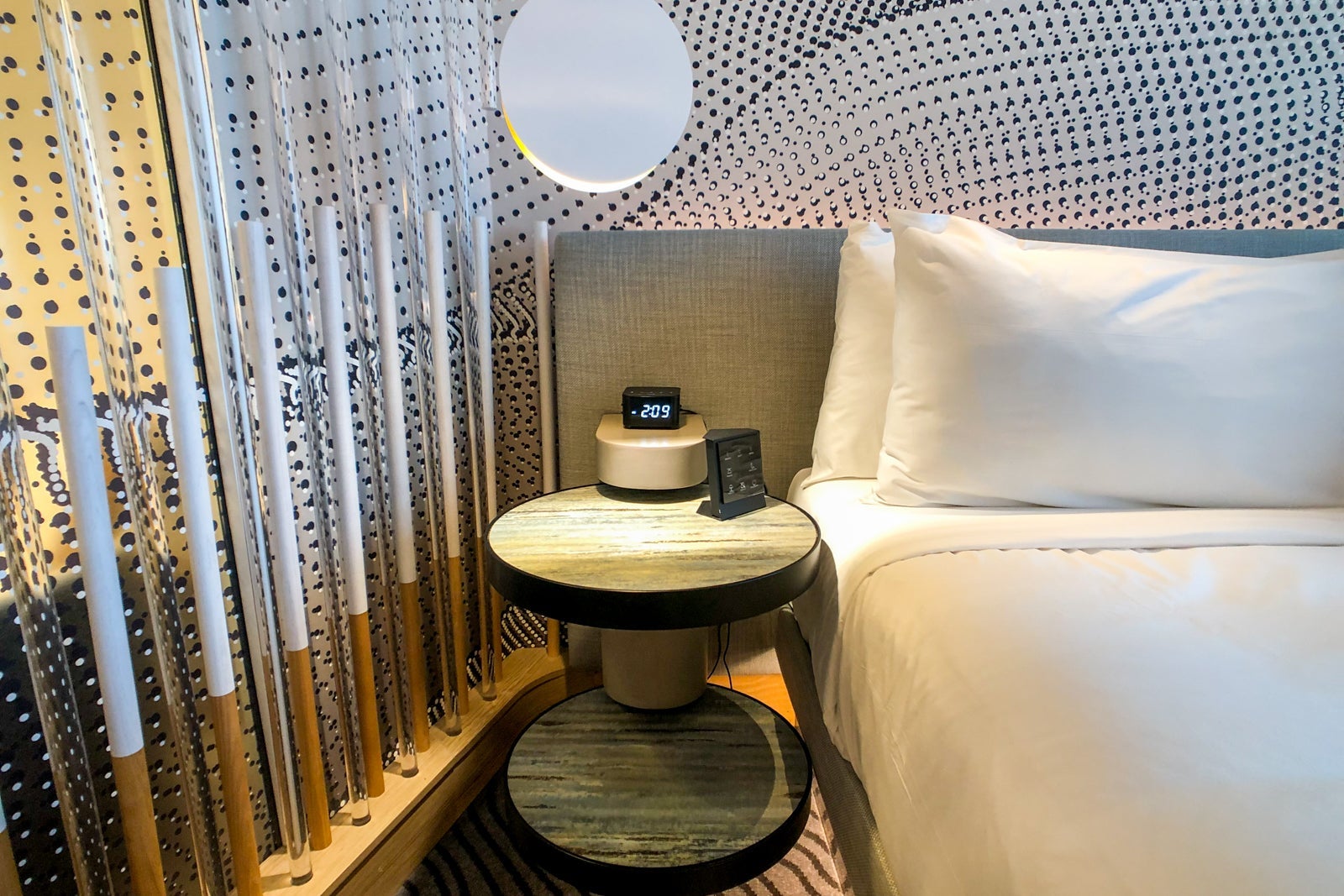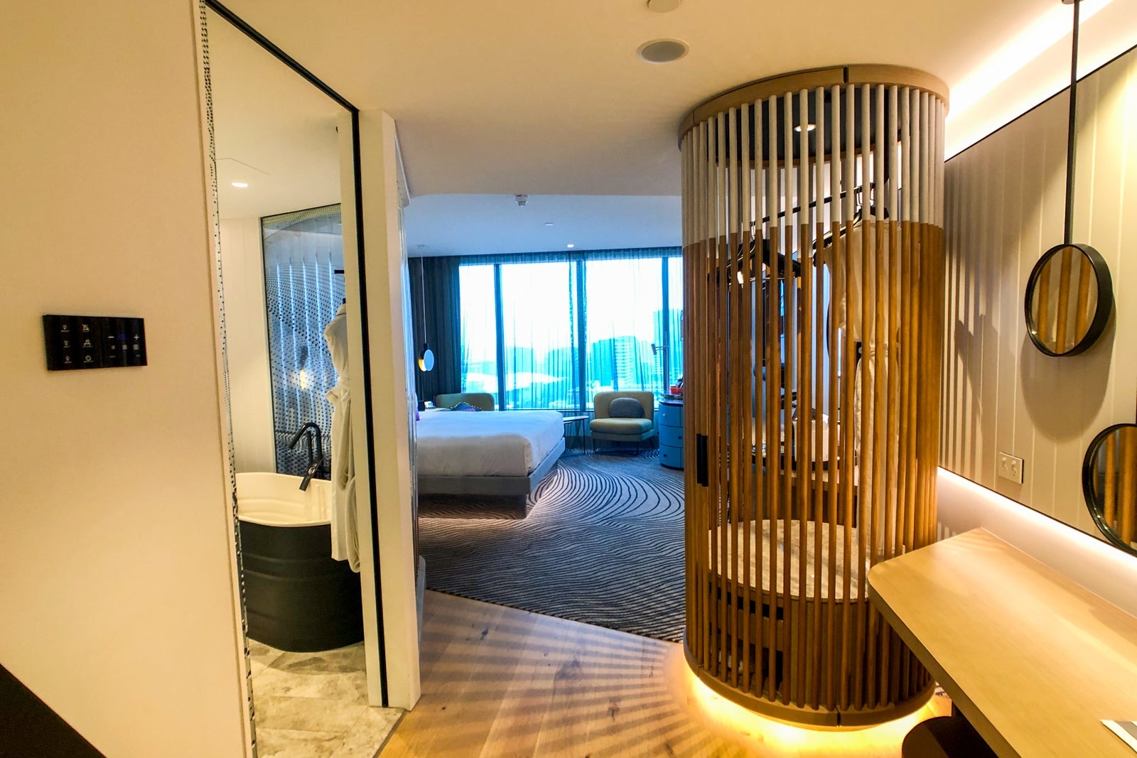 As with the rest of the hotel, the decor in the guest rooms is inspired by the Brisbane River. In my Spectacular room with a full river view through a wall of windows (with electronic blinds controlled by bedside touchscreen panels), that meant swirling, curling wall and carpet patterns, a birdcage-like closet enclosed by reedy wooden rods and a neon throw pillow emblazoned with a cockatoo profile ornamenting the comfortable, king-size W Hotels Bed.