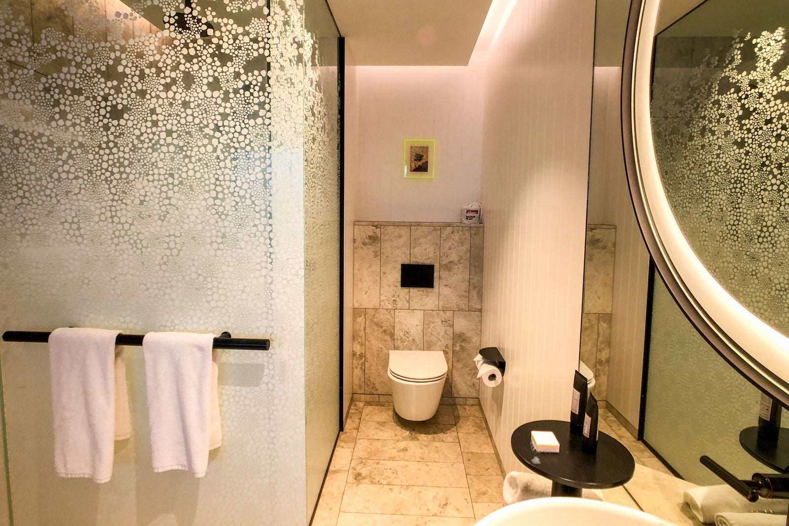The glassed-in bathroom held an eye-catching trough tub and a single sink and vanity plus a walk-in shower and separate toilet room – however, you could only use one at once with any privacy since the glass door slid from one side to the other but did not close both at once. Thanks to W's departure from Bliss bath products, this hotel featured melon-scented Momo ones by Italian brand Davines.