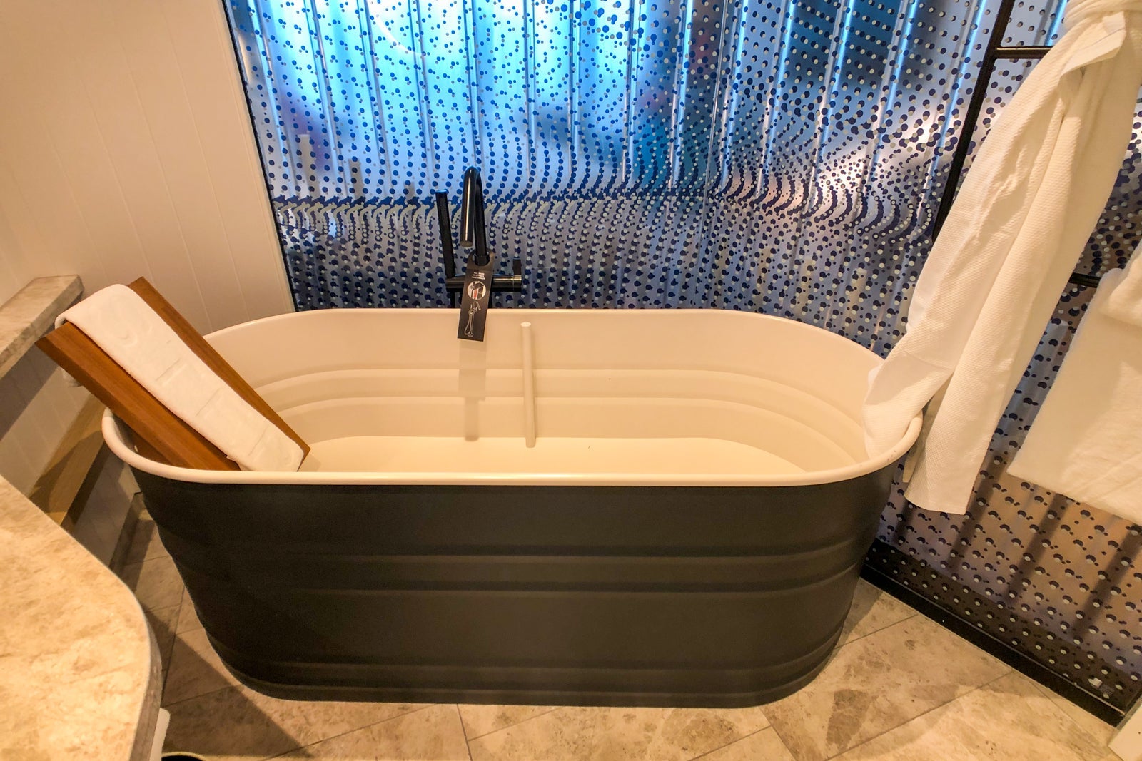Rooms, meanwhile, feature playful references to the area's resilient residents and river systems. White wooden wall paneling hearkens to the siding of traditional Queenslander houses. Turquoise minibars are modeled on post-war food safes. Side tables are shaped like giant boomerangs. And the bathtubs – separated from the bedrooms by glass walls frosted with pointillistic water droplets and both wood and Perspex rods meant to recall river reeds – are fashioned like sheep station (ranch) water troughs. It's like looking at a black-and-white movie about Queensland that's been colorized.