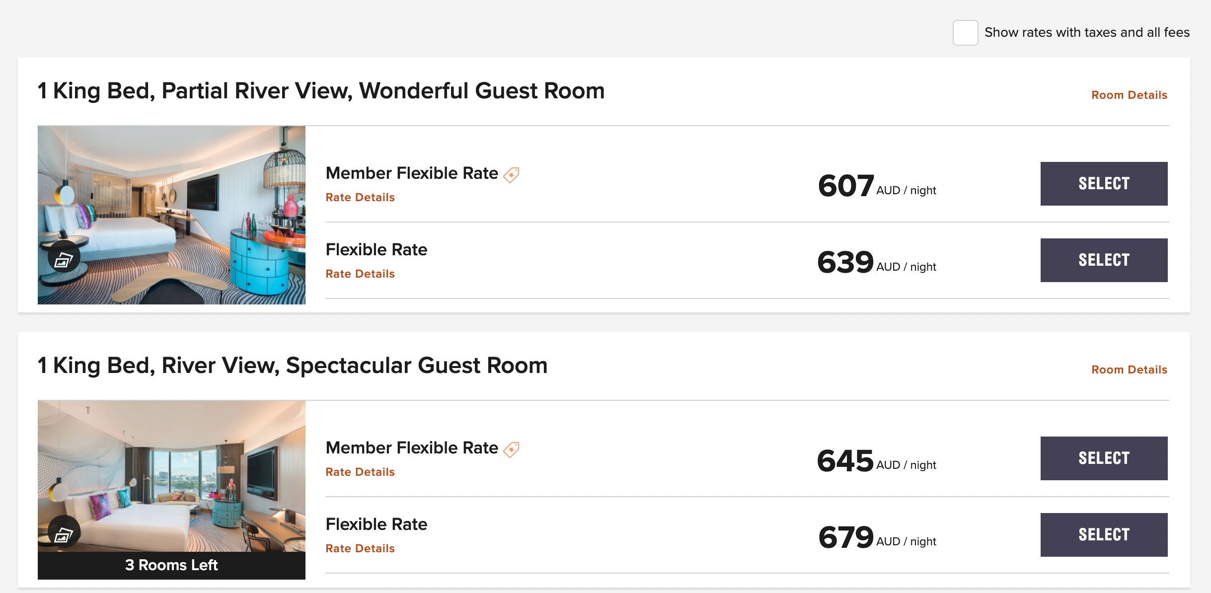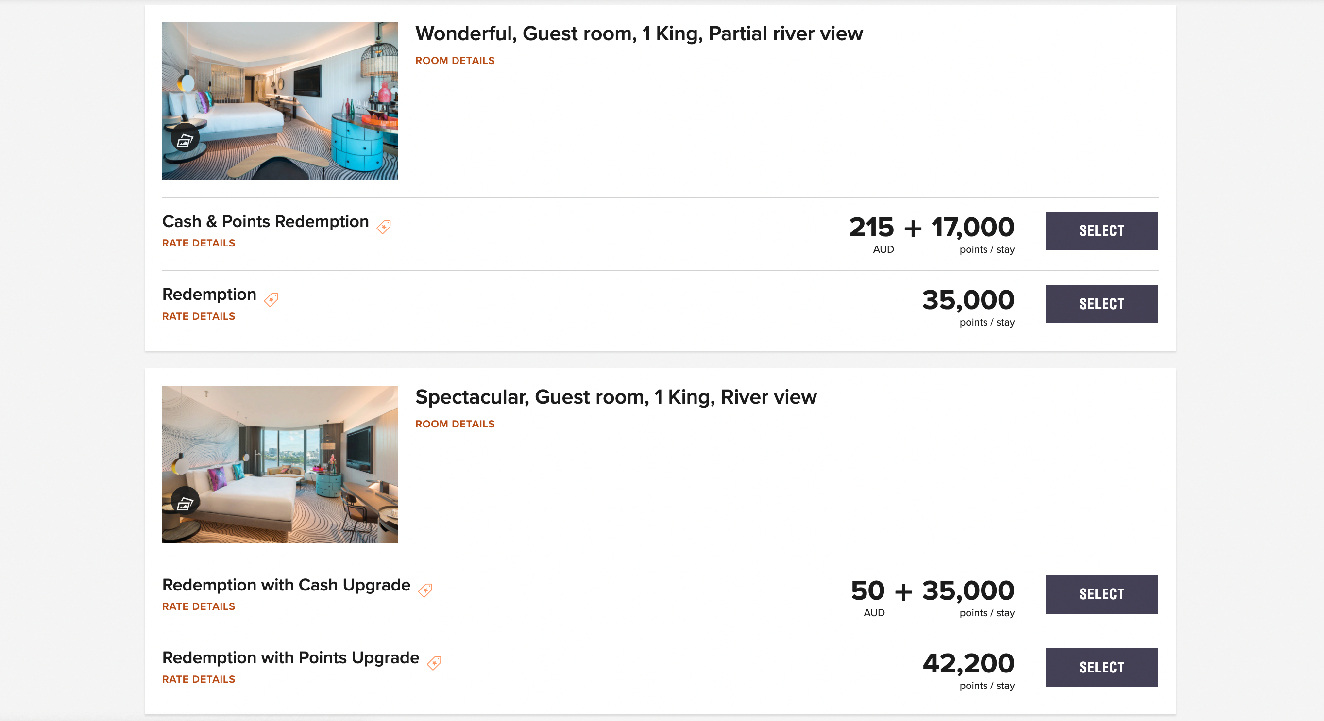 However, there was also award availability for just 35,000 points per night, which I ended up booking. That netted me a value of 1.28 cents per Marriott point, well above the 0.8 cents apiece which TPG values Marriott Bonvoy points to be worth. I ended up getting even more value from my points when I was upgraded to a Spectacular room with a river view and a king bed, which would have cost AU$645 ($477) thanks to my Marriott Bonvoy Gold elite status.