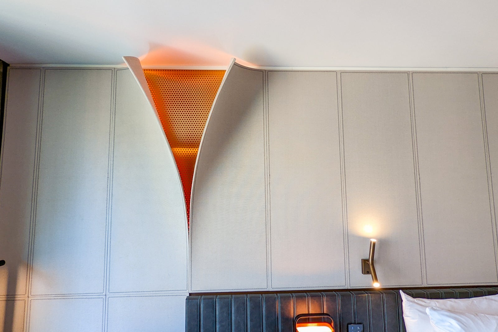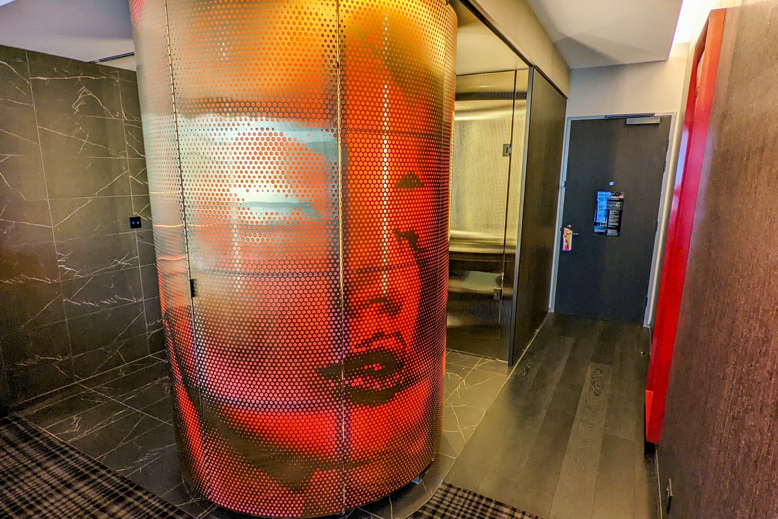 The standout feature of the room was a dramatic, perforated metal fixture, also inspired by the city's curbside kiosks. It opened up into a wardrobe, while its reverse side shielded the bathroom's freestanding sink and vanity. The artwork of a female face spray-painted onto the metal grating reminded me of my favorite record label, the disco-inspired Glitterbox; she was just the sort of memorable club kid you'd love to meet on the dance floor of a nearby nightclub like The Toff in Town or Brown Alley.