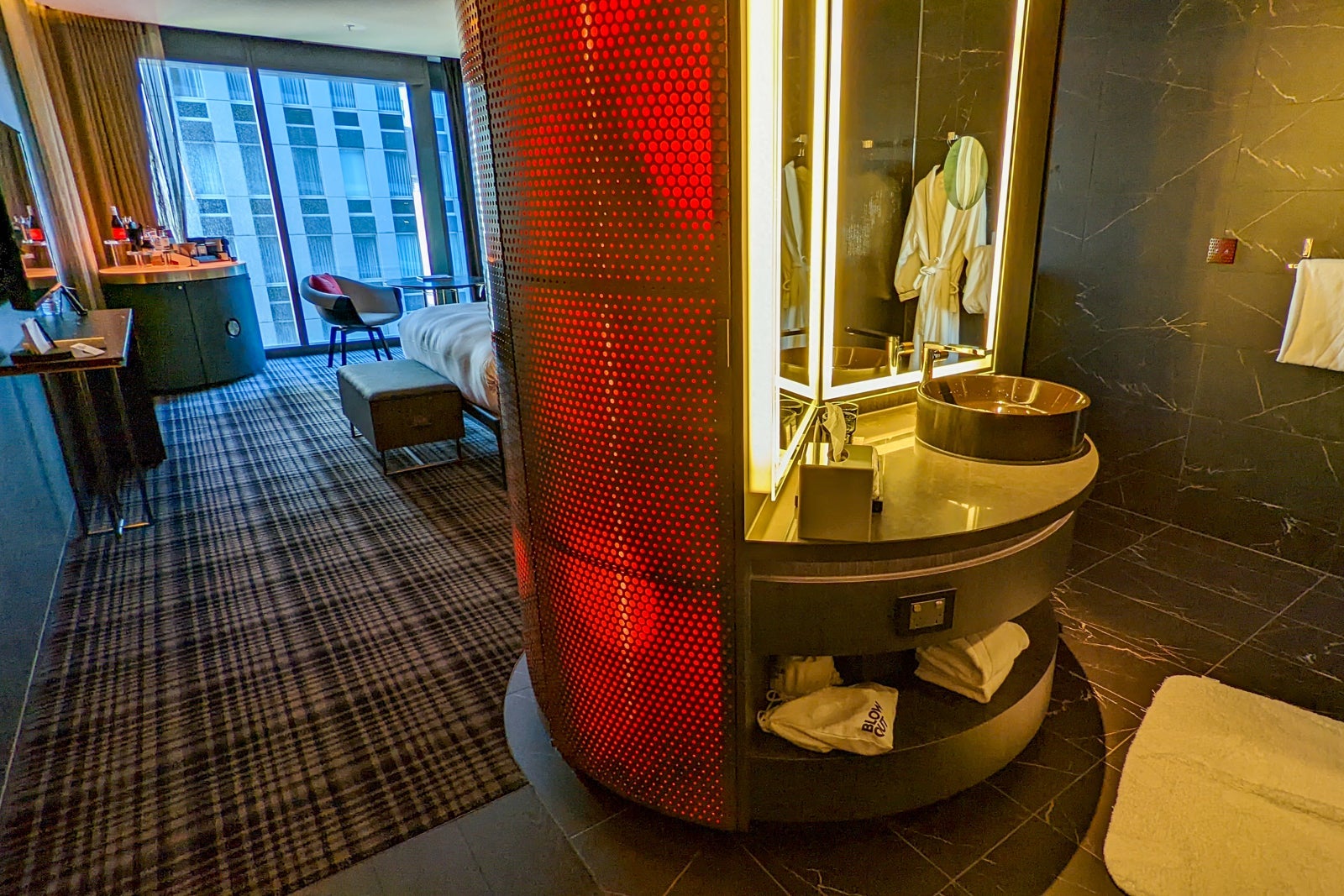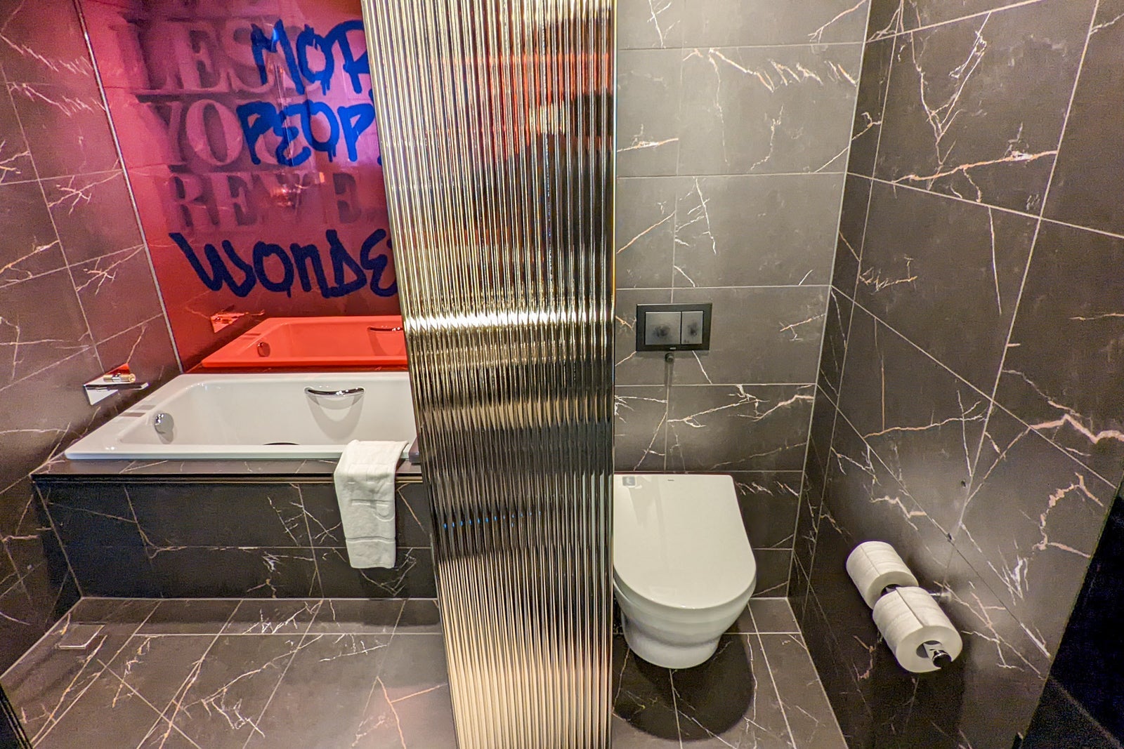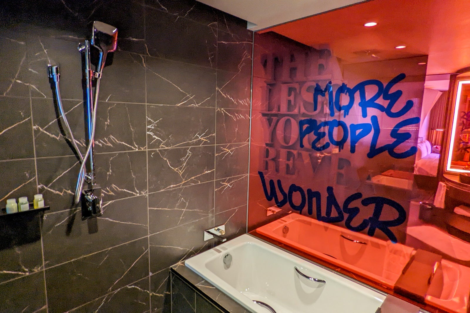 The bathroom featured a wet room with both the shower and bathtub, plus Momo toiletries in small bottles. Graffiti scrawled on the back, mirrored wall gave the space a faux-gritty feel, and I appreciated the reference to Melbourne's Instagrammable (and likewise graffitied) laneways.