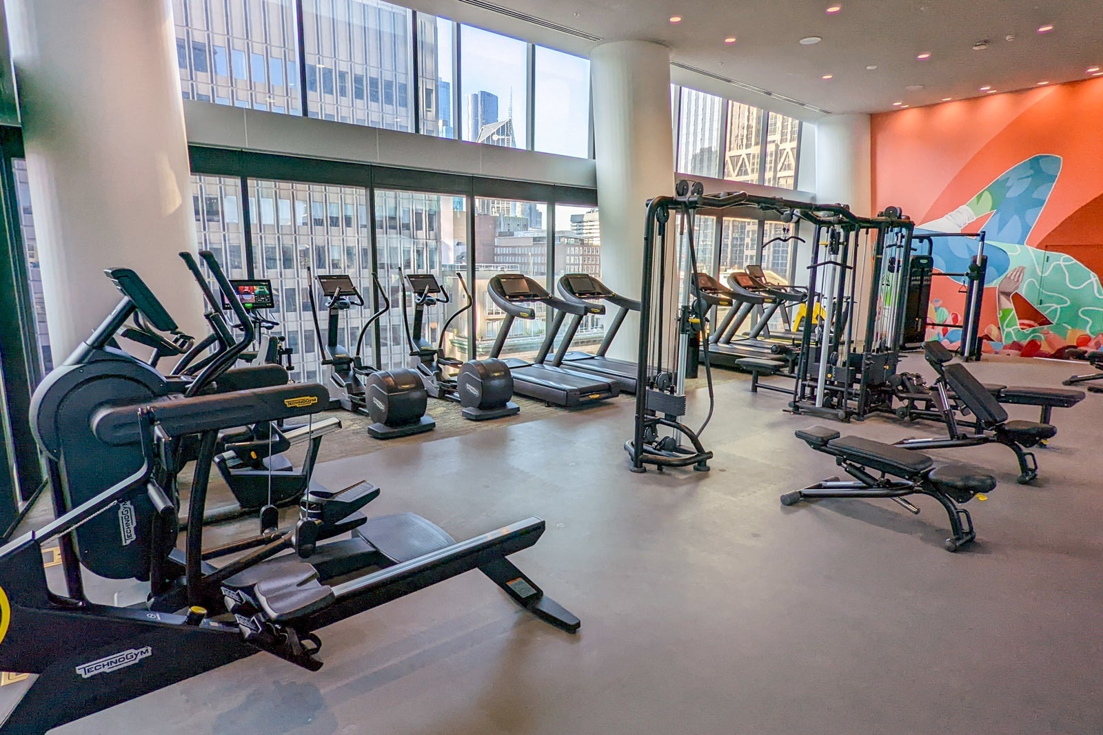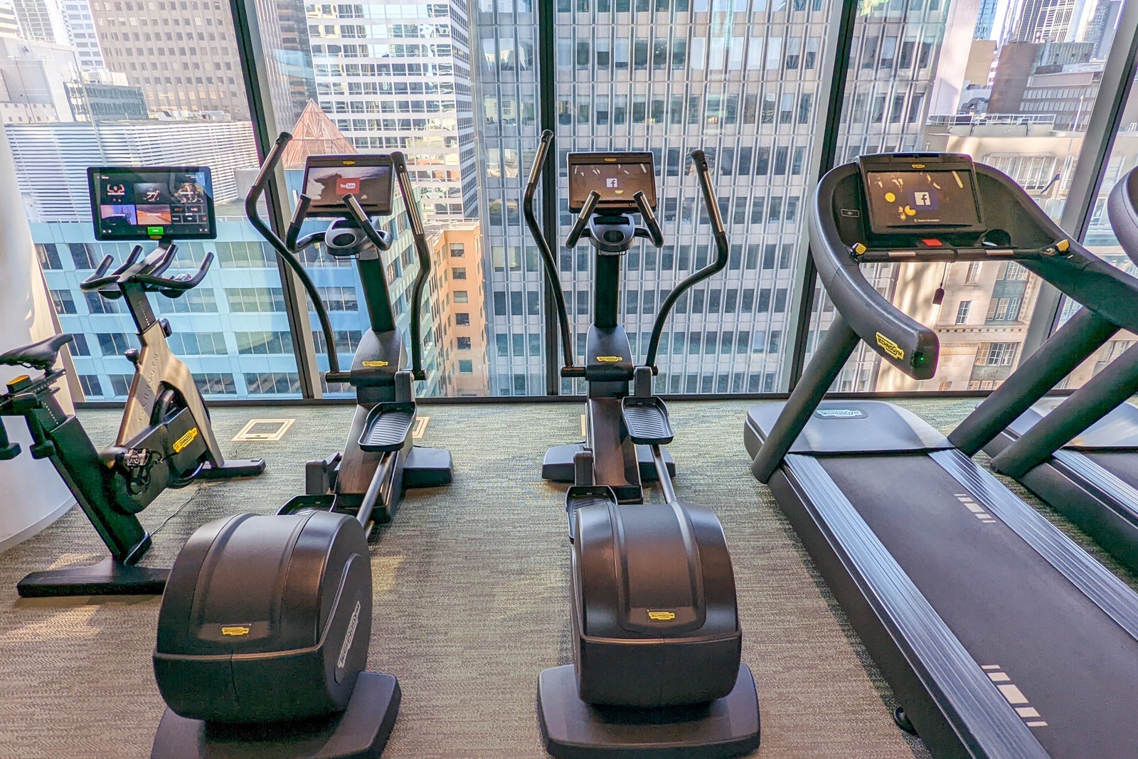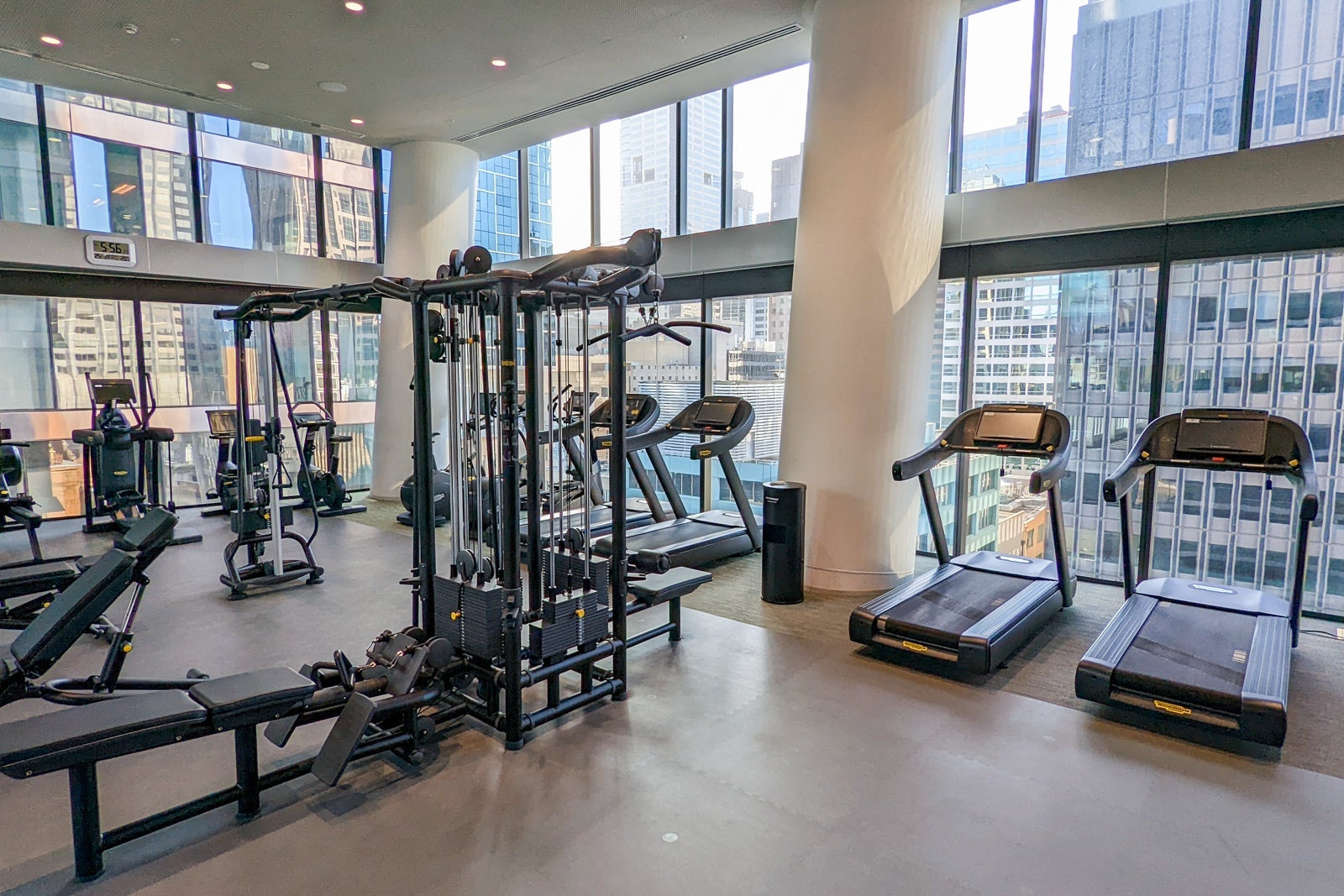 The spacious gym contained new weight and cardio equipment and boasted the same dramatic views of the city skyline as the pool.