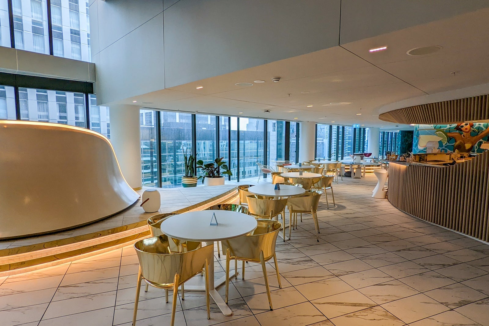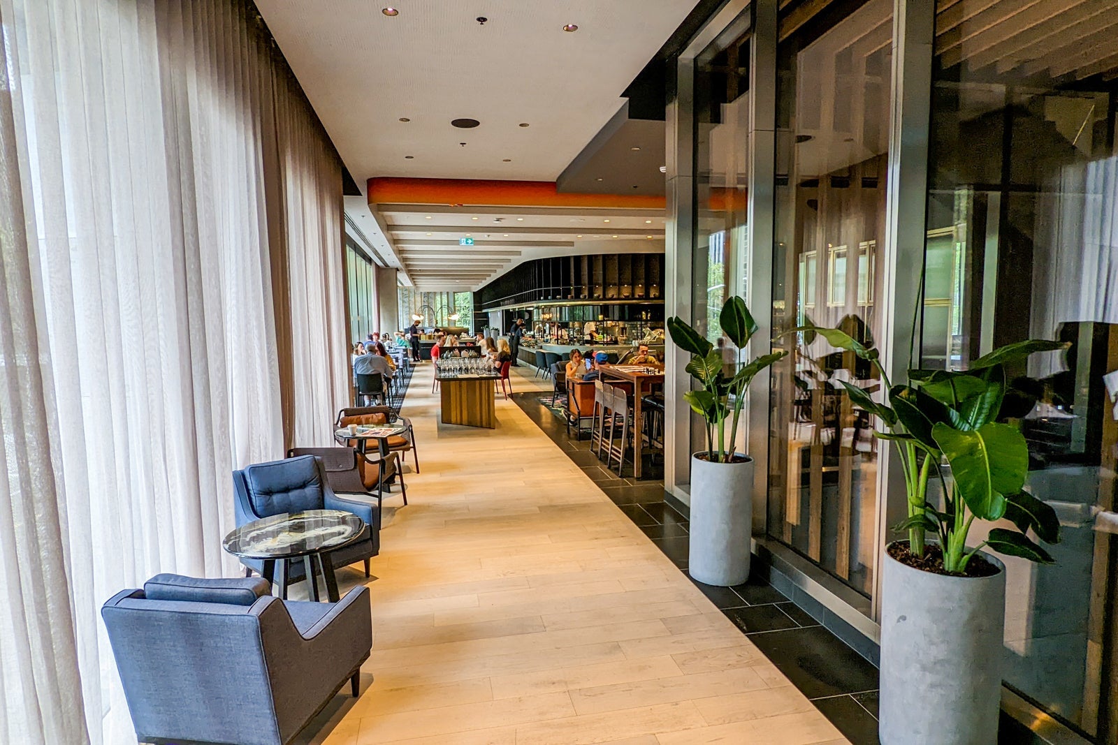 Stepping inside, though, I found myself in a spacious room with floor-to-ceiling windows, a relatively muted grayscale color scheme, and just a few grin-inducing, cheeky touches such as wall-paneling peeled back like a newspaper being opened (a nod to the street-level news kiosks Melbourne is known for).