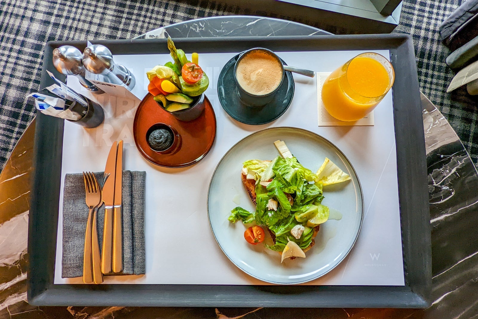 For my final service, I ordered the Skip the Sugar set menu via room service for AU$36 ($26), which included a cup of crudites with charcoal hummus and a tomato-avocado tartine. The latter was thankfully free of the previous day's sauces, and overall a far more satisfying offering.