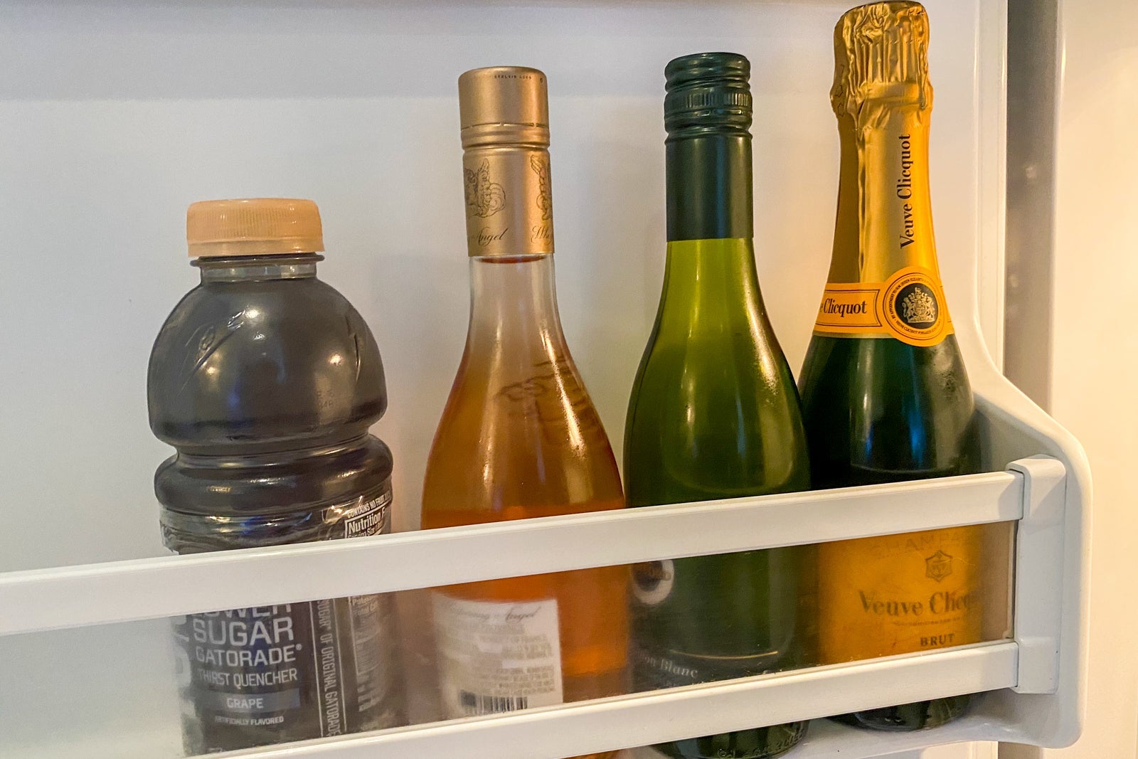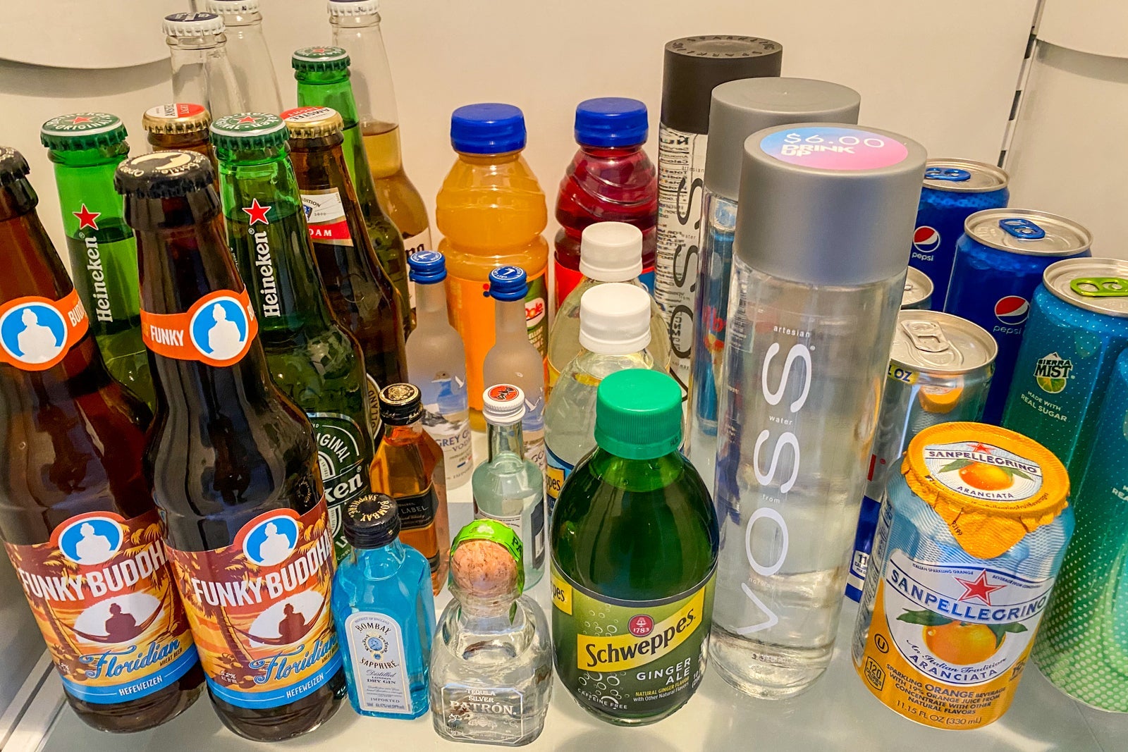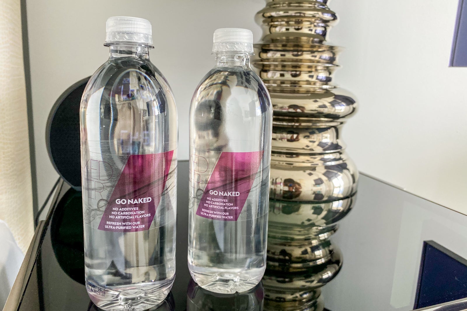 The minibar was stocked with juices, Gatorade, San Pellegrino soda and Voss water, along with alcohol like Patrón tequila and Bombay Sapphire gin. There was another smaller minibar on a table near the balcony with larger bottles of Grey Goose and Patron and another minibar with snacks. Two water bottles were waiting on the nightstand on arrival.