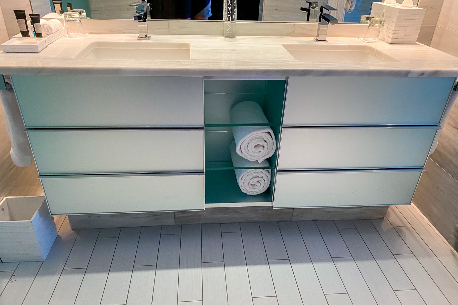 Immediately upon entering, you'll find the bathroom on your left side, which contained a double vanity, WC and shower. Unfortunately, there was no tub. The drawers were stocked with a razor, makeup removal kit and dental kit. A comfy robe was waiting in the bathroom and I found a pair of slippers in a nearby closet.