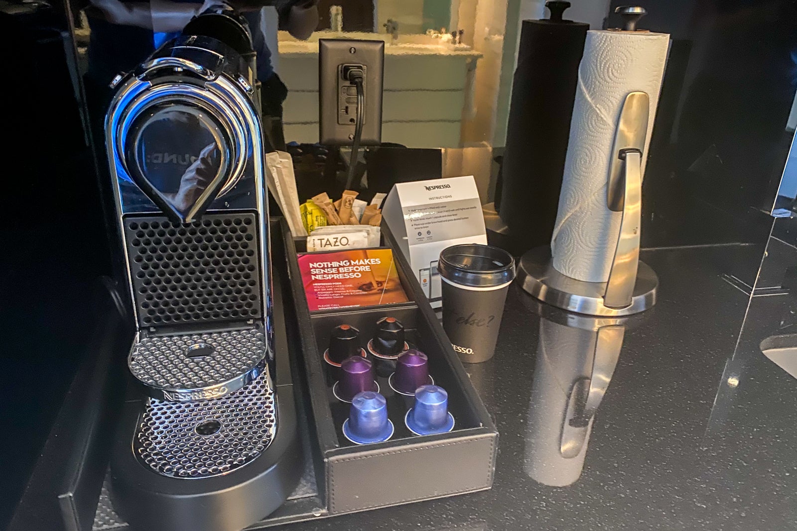 Moving into the room, I found a Nespresso espresso machine with coffee pods.