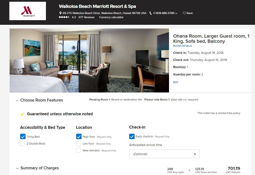 We booked our two-night stay shortly before arriving on Hawaii's Big Island. We booked an Ohana larger guest room with one king bed, sofa bed and balcony for $701 including taxes, or about $352 per night, using the AAA rate. It was a Category 6 hotel, so if we'd used points, it would have cost us 50,000 points per night, which TPG's latest valuation valued at $450. Note that a $30-per-night-plus-tax resort fee was charged even on award nights.