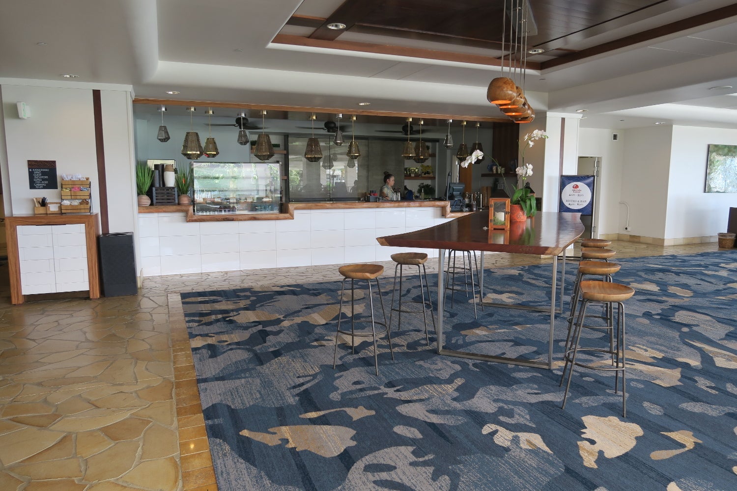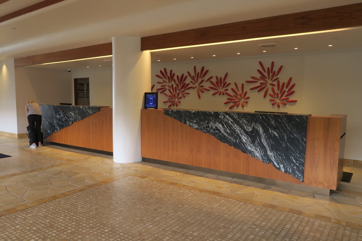 After self-parking, we carried our Osprey backpacks the short distance to the lobby. Although the family entering the lobby ahead of us was greeted with shell necklaces, we were initially ignored by the greeter. He only brought us necklaces after we'd gotten in line at the front desk to check in.