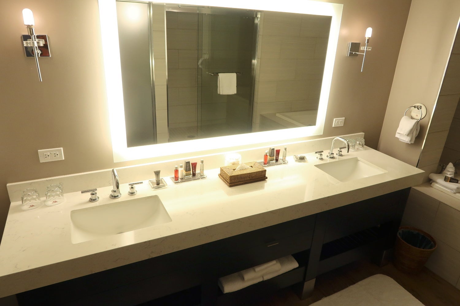 To the left of the walk-in closet was a large bathroom. There was a tub, large shower, two sinks and a large toilet stall. The water pressure in the shower was low, and it was impossible to take a cool shower, since the coldest setting was still rather warm.