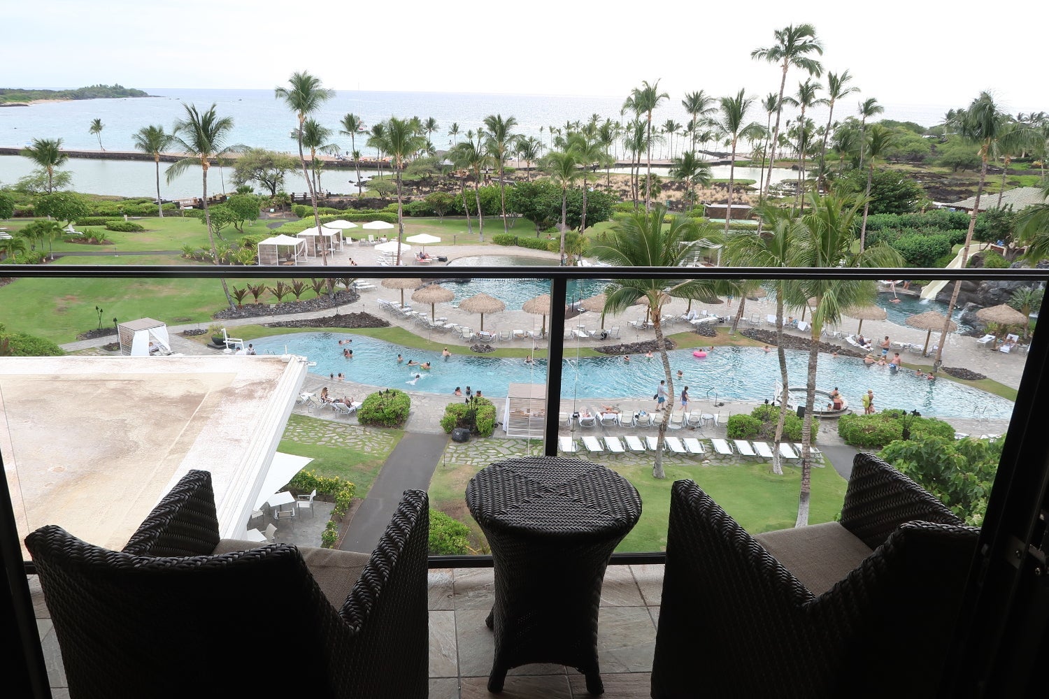 The living room and dining room shared a balcony with four chairs, a coffee table and a smaller table. The view from the balcony was perhaps the best view on the property, as it looked across the pool and luau grounds to Anaeho'omalu Bay.