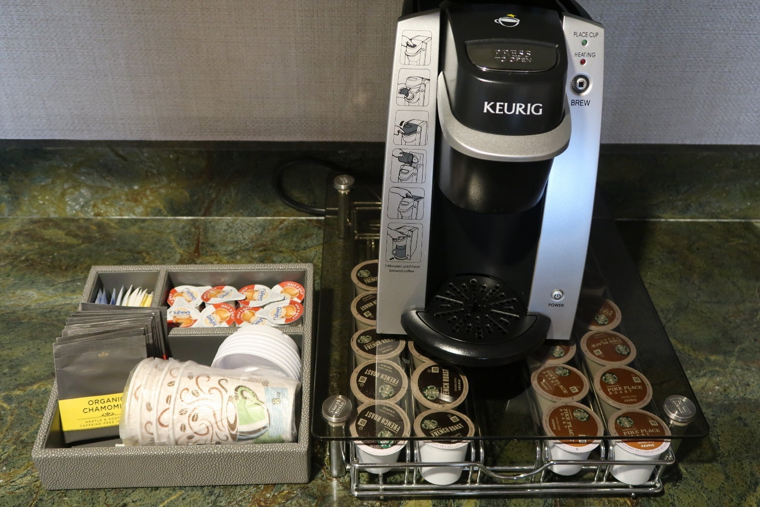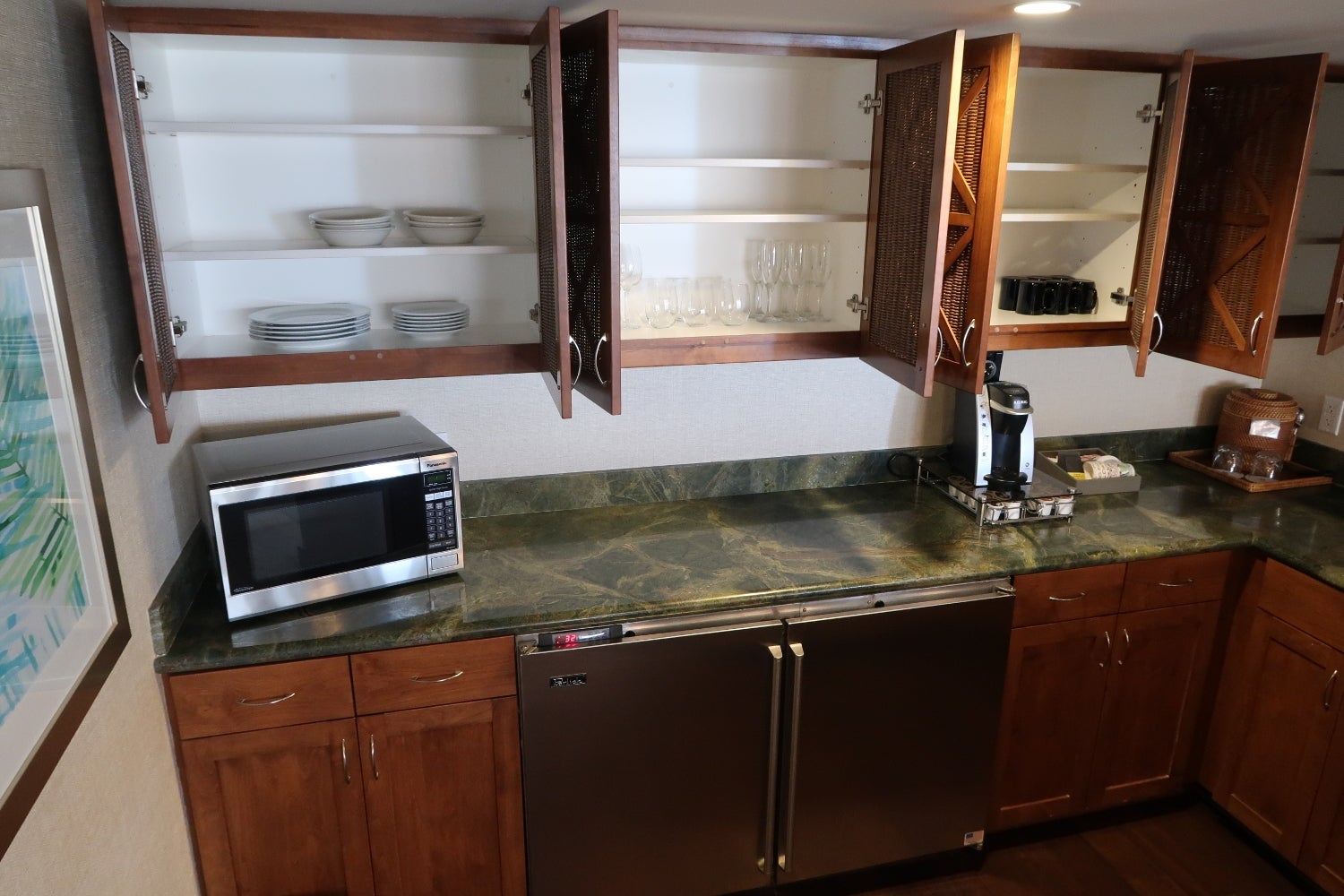 There was a Keurig coffee machine with plenty of coffee pods and creamer, a microwave, an ice bin and a large sink. But there wasn't a dishwasher, dish soap or any kitchen towels.