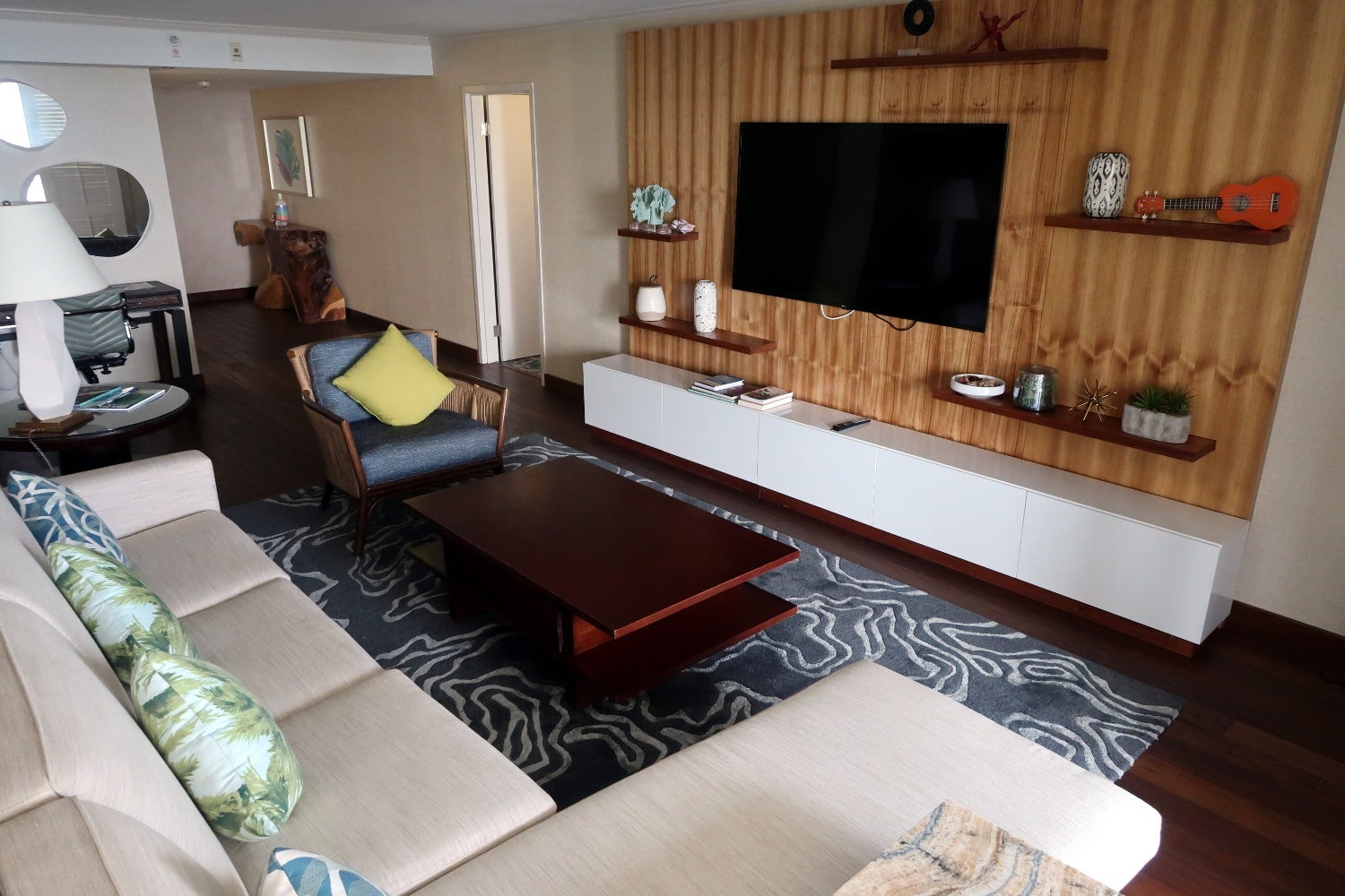 The living room included a 65-inch flat-screen TV with a couch, chair and coffee table. Various Hawaiian-themed books and decorations surrounded the TV.