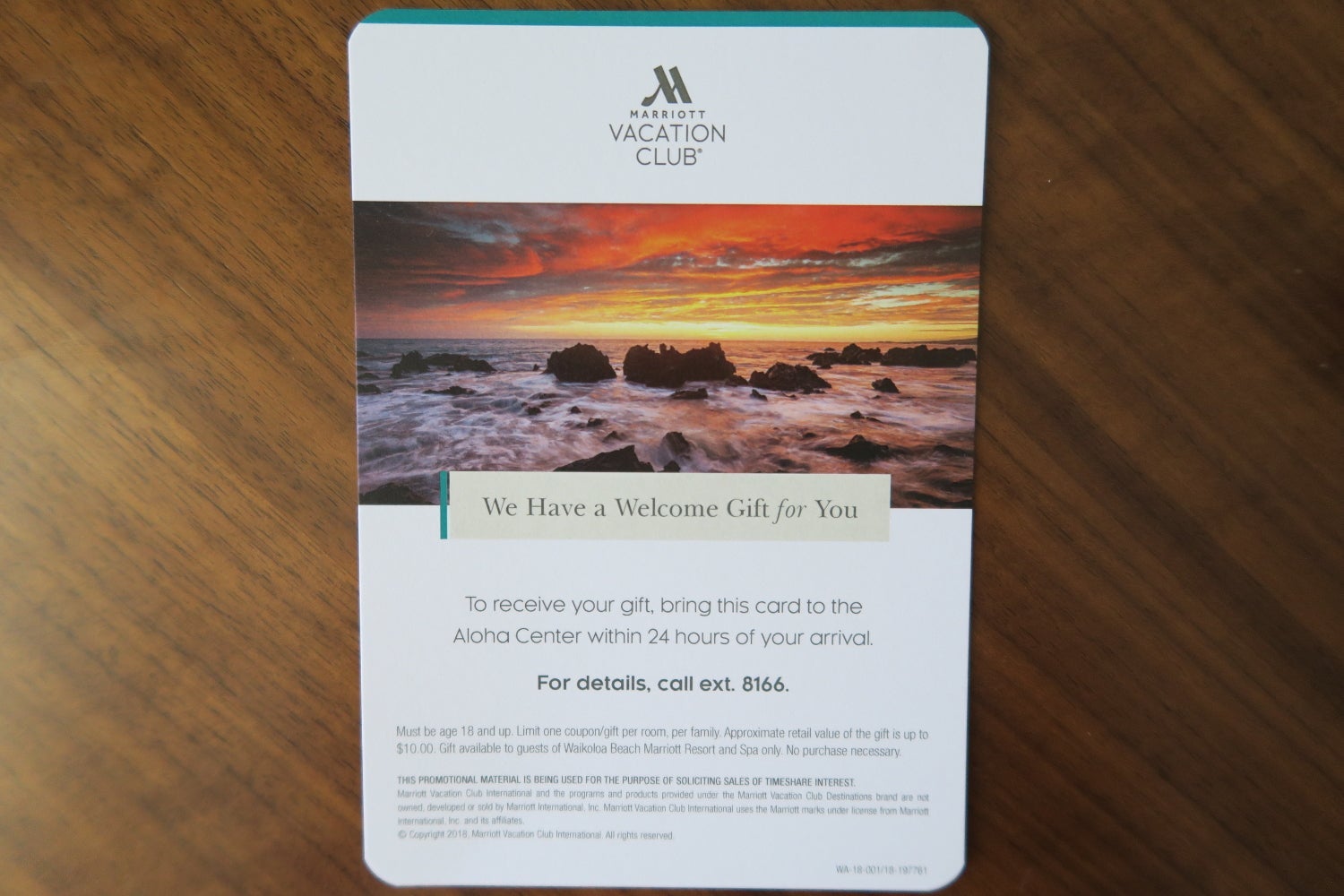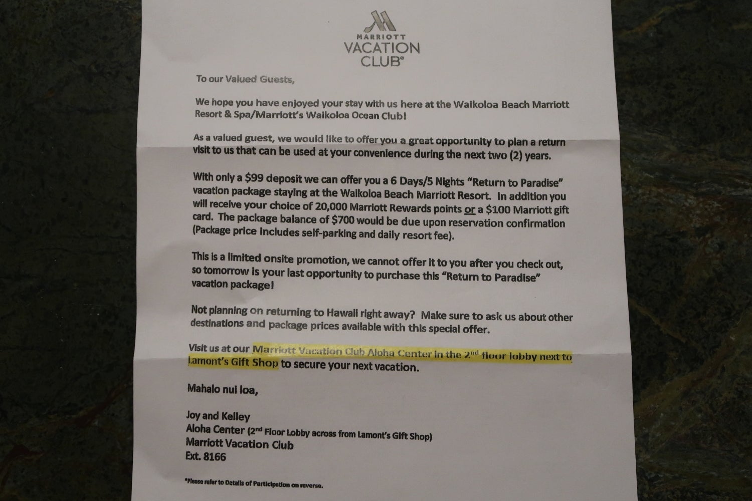 We also found a letter under our door before checkout offering a six-day vacation package for $799. Both of these advertisements contained small print noting that the purpose of the promotion was to solicit timeshare sales and that attendance at a 90-minute timeshare presentation was required if you accepted the vacation deal.