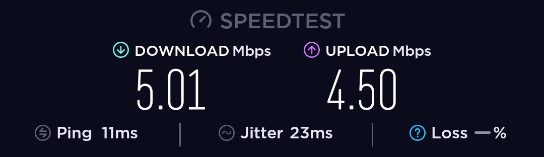 The enhanced internet access wasn't enhanced or high speed, at just 5 MBps upload, 4 MBps download and 11 ms ping. It was stable, though.