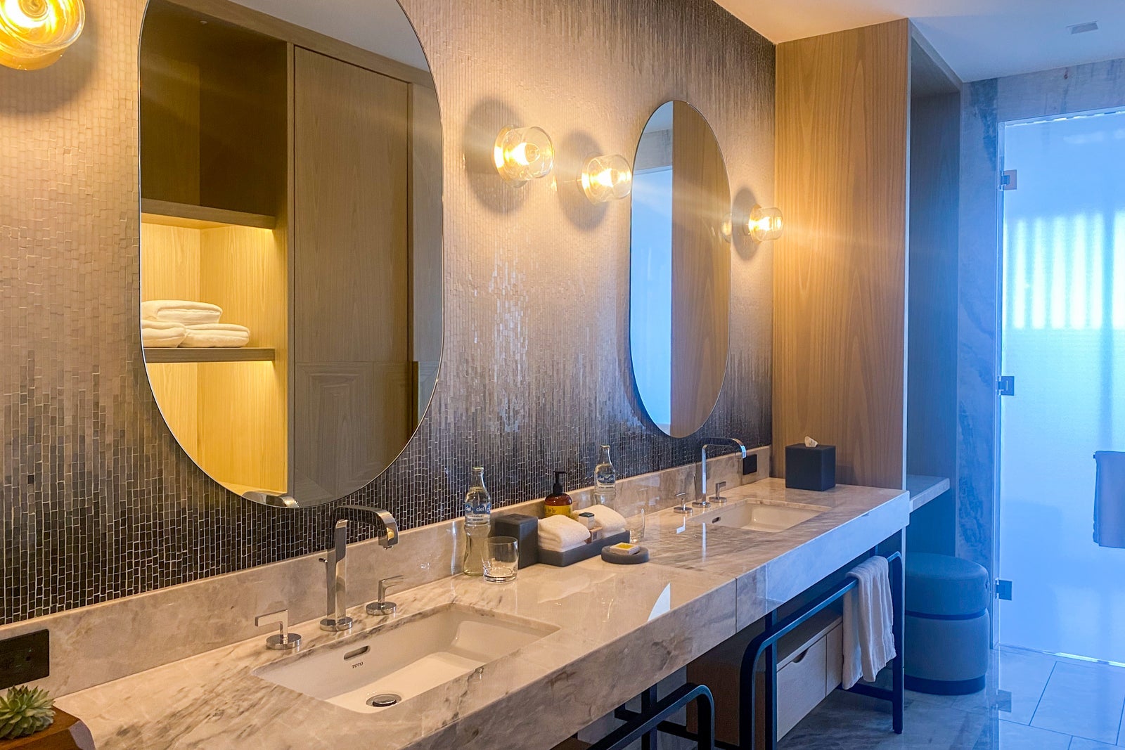 Two marble vanities with oval mirrors set in shimmering mosaic tiles were separated from the bedroom by a wooden screen-style wall mounted with a flat screen TV.