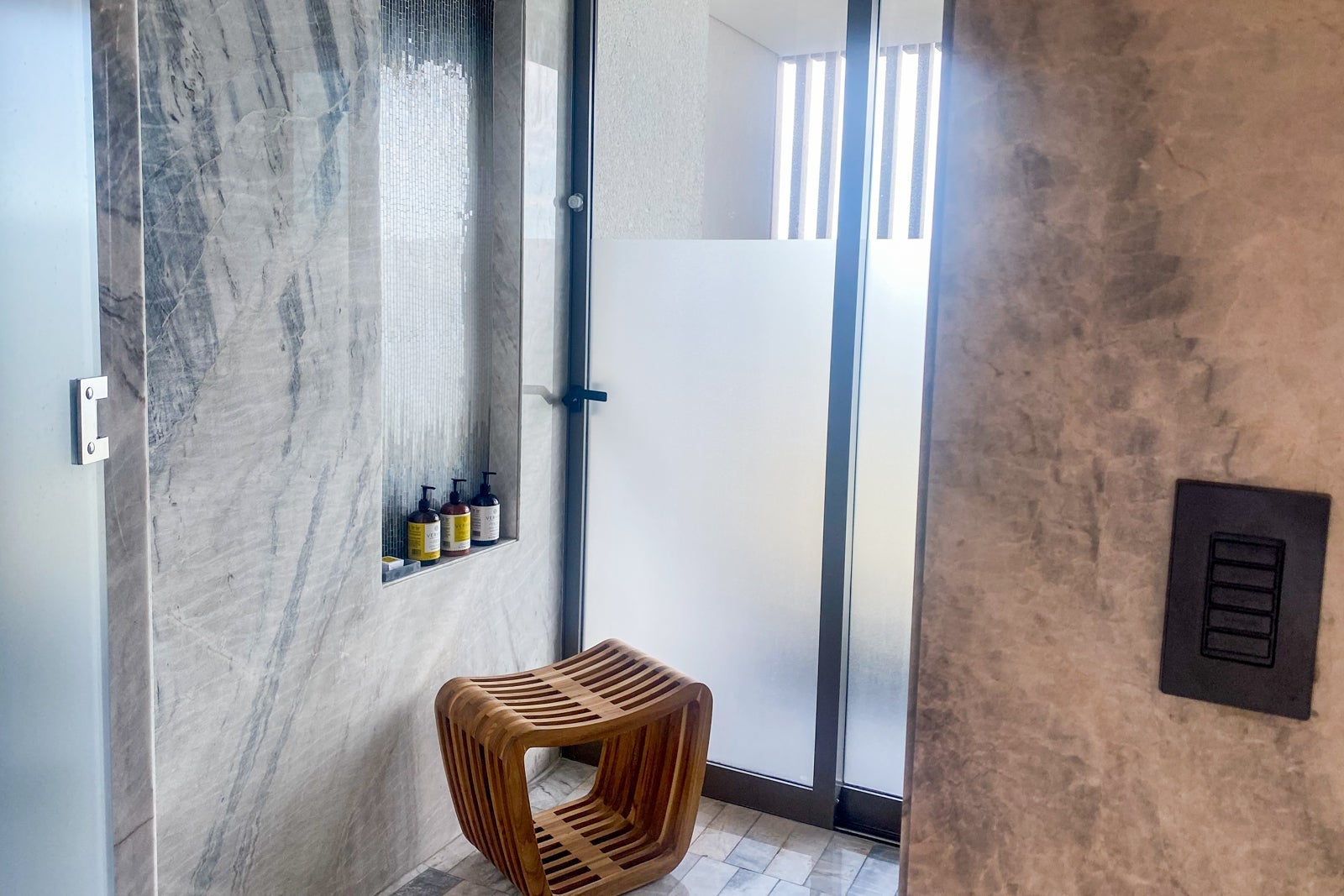 Spanning one side of the bedroom, the bathroom was spacious, opulent and practical. A separate gray-tiled shower unit opened onto the deck with a built-in soaking tub.