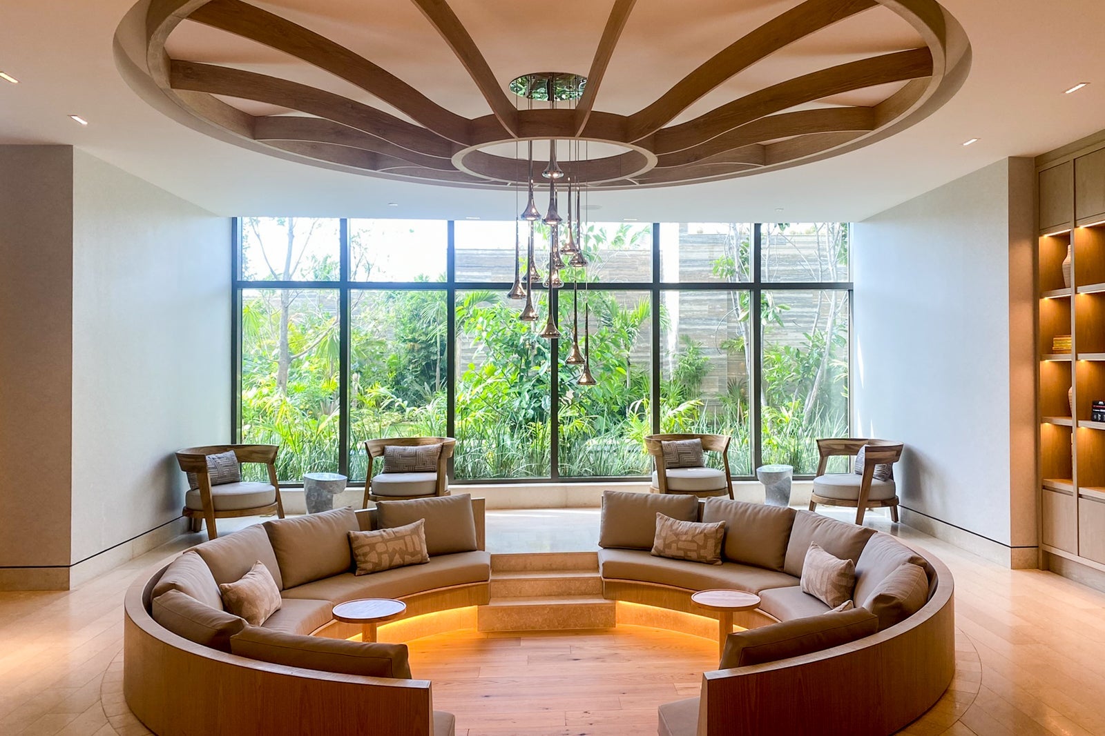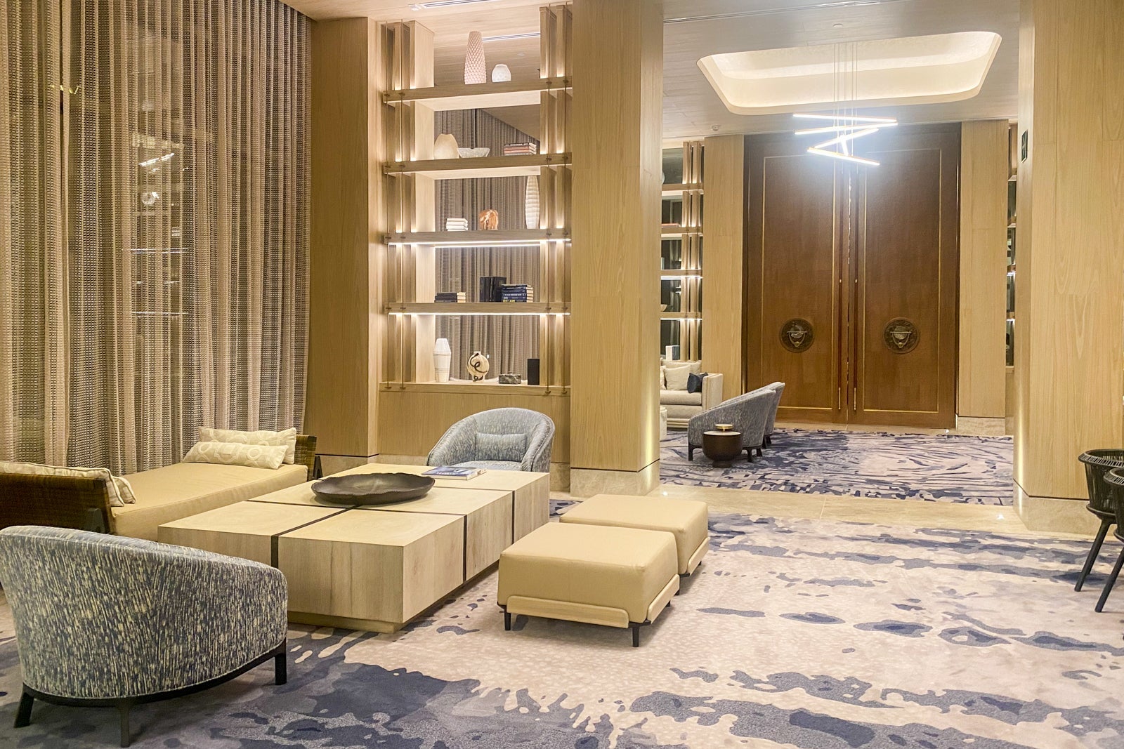In the company of personal concierges, arriving guests disperse to more intimate, secluded nooks off the main reception area or linger over welcome cocktails on curved armchairs and plush sofas in muted gray and beige tones.