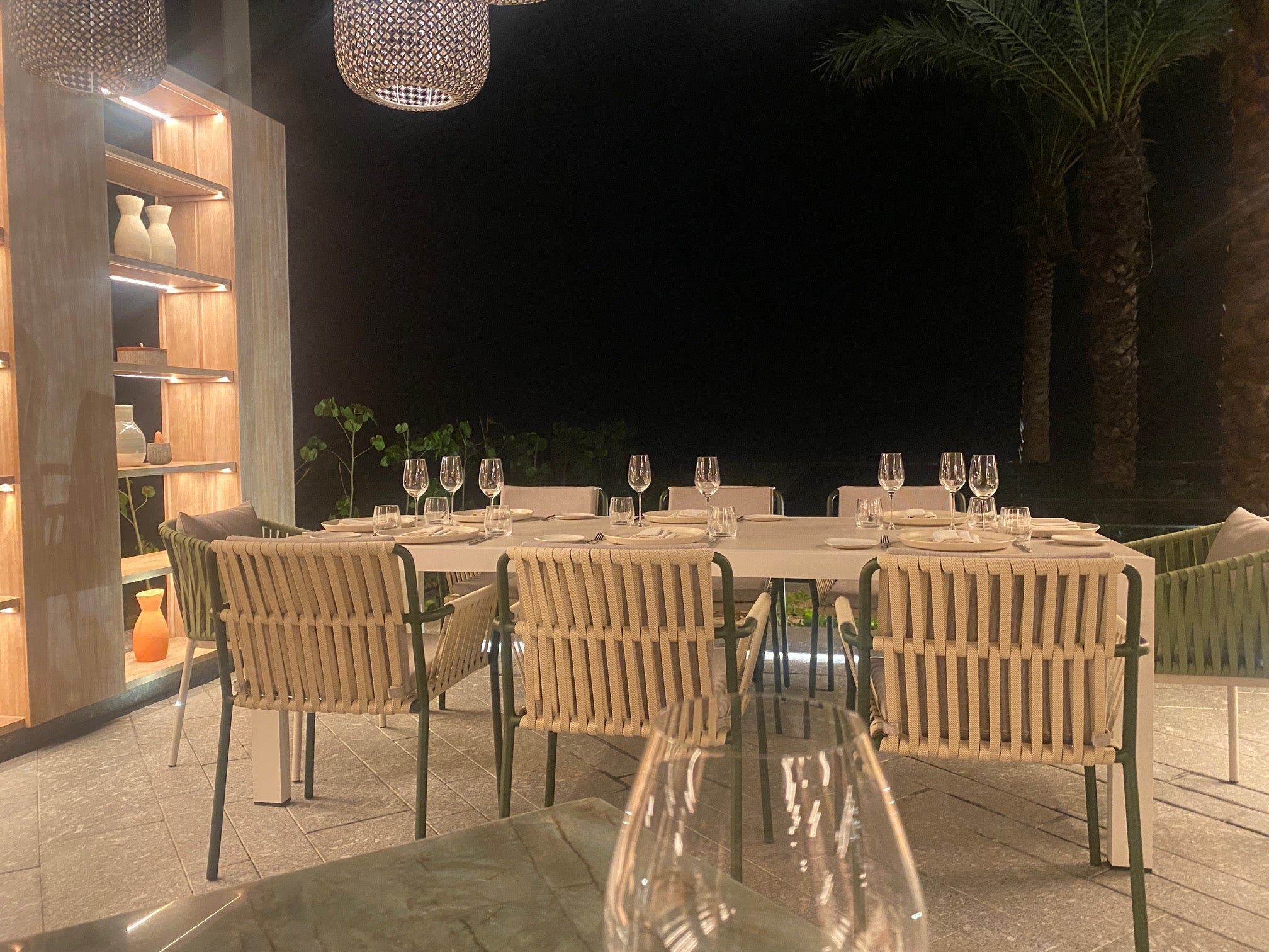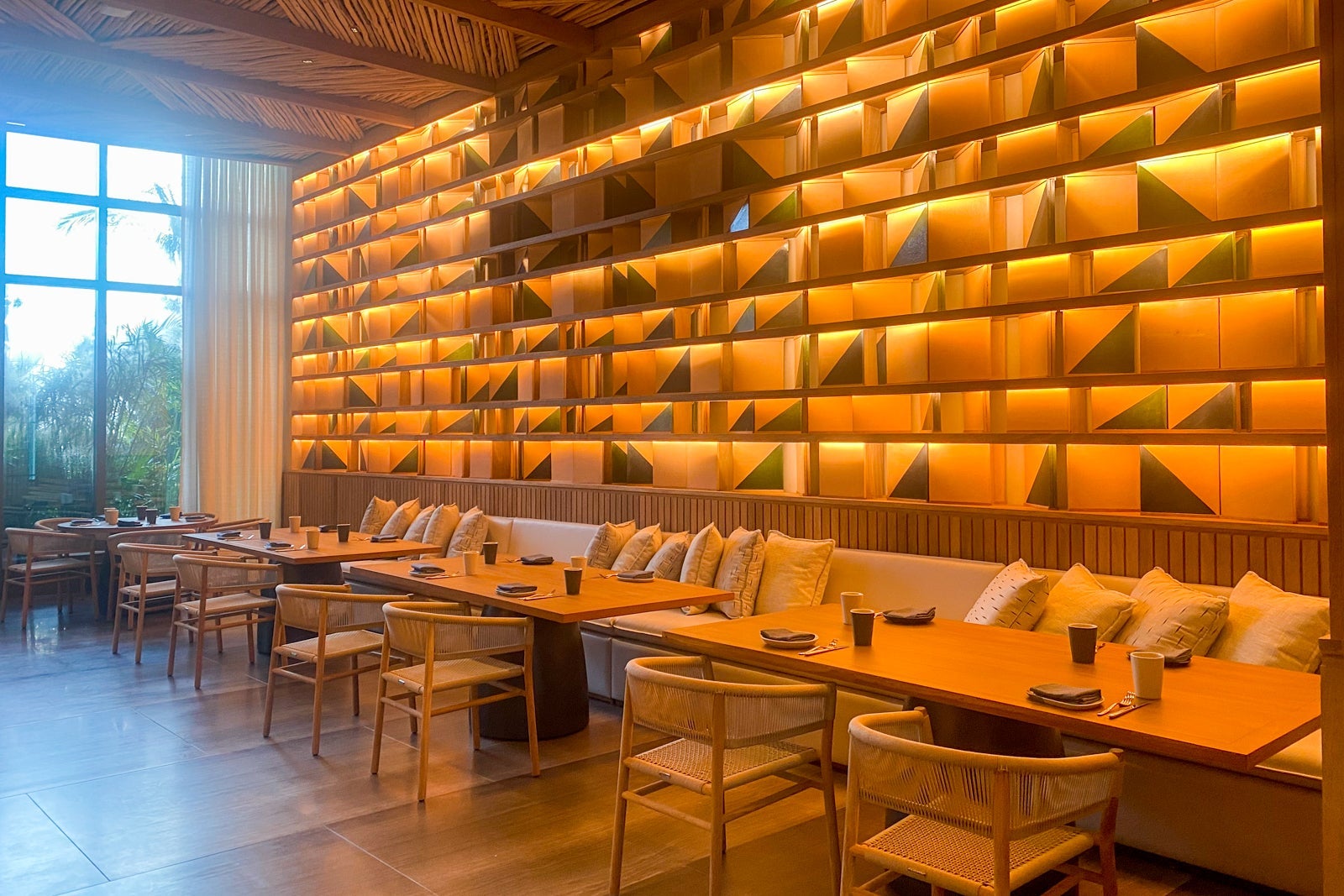 Inside, there was a buzzy vibe from the dynamic open kitchen, but the best tables were outside on the terrace, alongside a dramatically illuminated reflection pool, where simple white chairs fashioned from natural fibers and comfy rattan sofas were surrounded by displays of Maya-inspired decorative objects and artifacts.