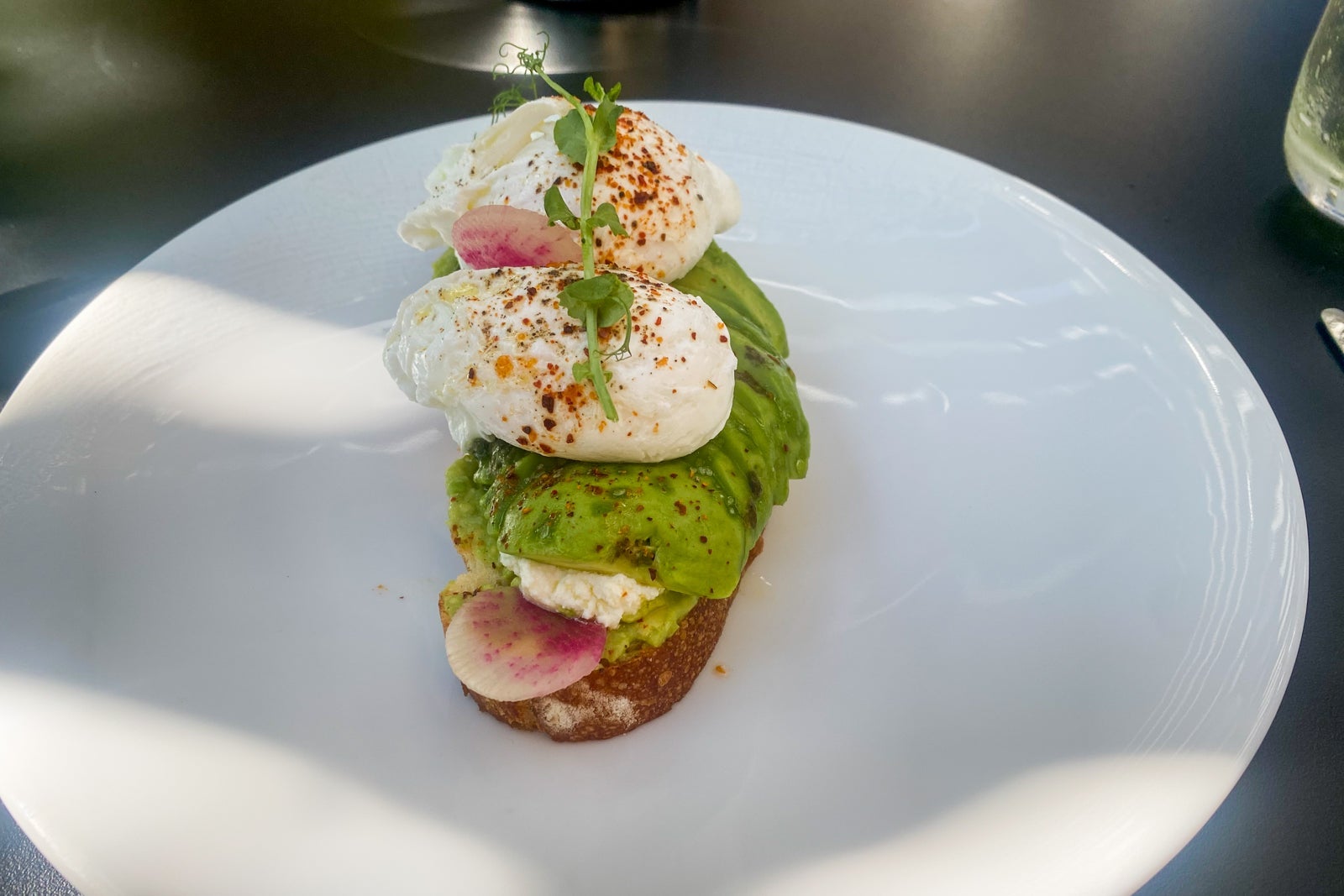 The menu featured breakfast classics with a Mexican twist — lobster omelet ($940 Mexican pesos/$49), eggs Benedict with crab and chipotle hollandaise ($460 pesos/$24) as well as more virtuous acai bowls ($300 pesos/$15) and smoothies ($240 pesos/$12), all prepared with locally sourced produce. I ordered avocado toast drizzled with lavender agave syrup and topped with poached eggs ($390 pesos/$12) which was flavorful, perfectly proportioned and artfully presented.