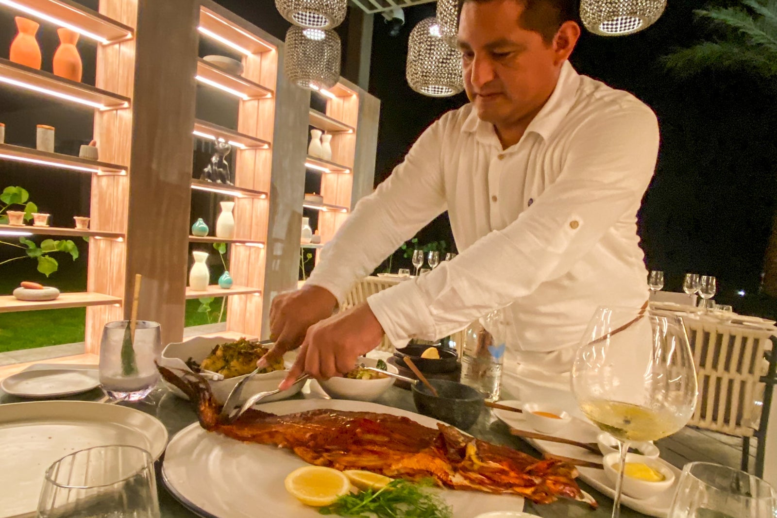 The "crudo" appetizer section of the menu featured tuna tiraditos ($610 pesos/$31), hamachi ($660 pesos/$34) and seafood towers for four people ($3,600 pesos/$185). Signature entrees included whole fish-of-the-day for two people ($1,900 pesos/$99) and chargrilled octopus ($690 pesos/$36).