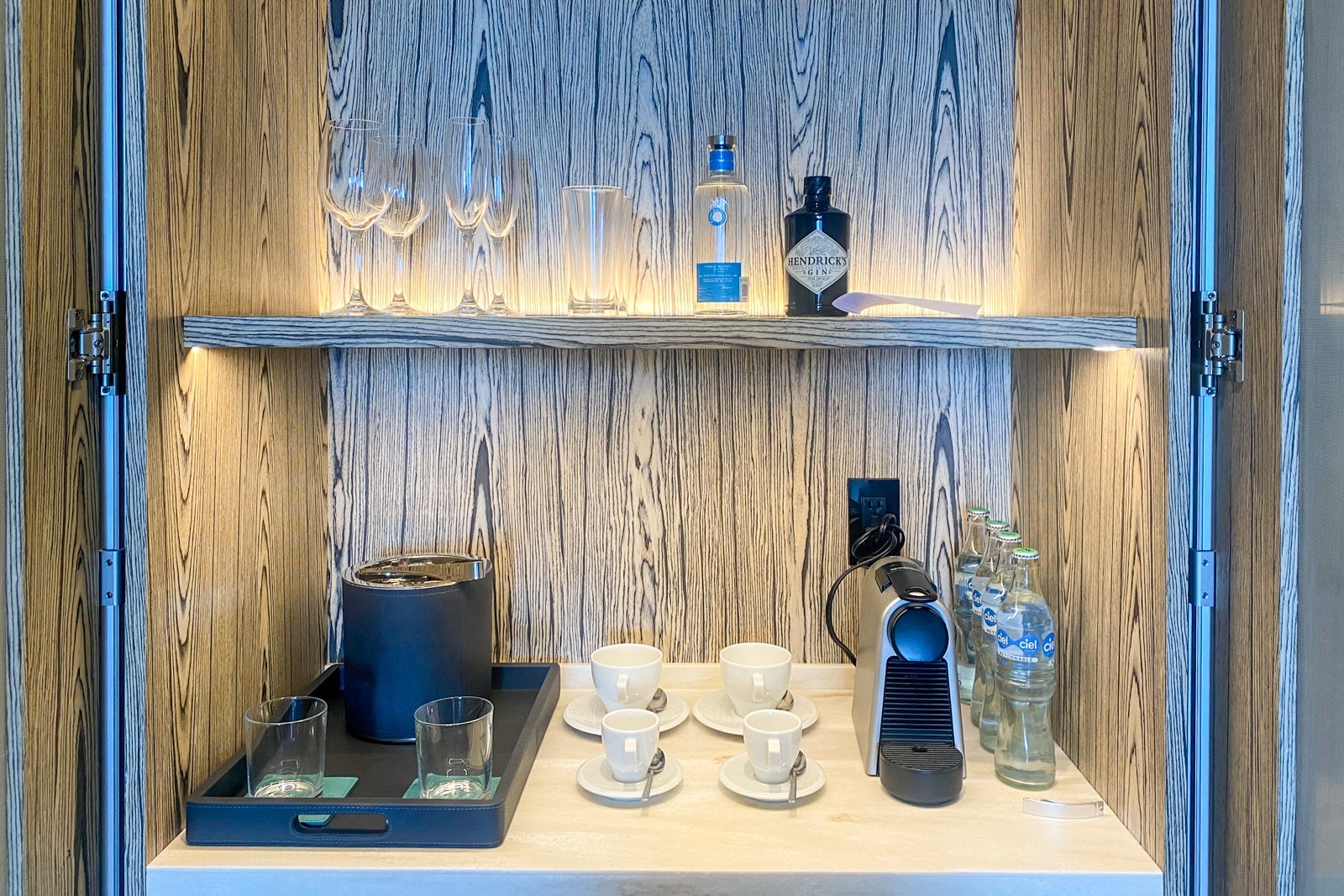 Decorative objects and furnishings are inspired by the ocean setting and Indigenous craftsmanship — whimsical tapestries, coral-inspired sculptures and a driftwood-style armoire that housed the minibar and Nespresso maker.