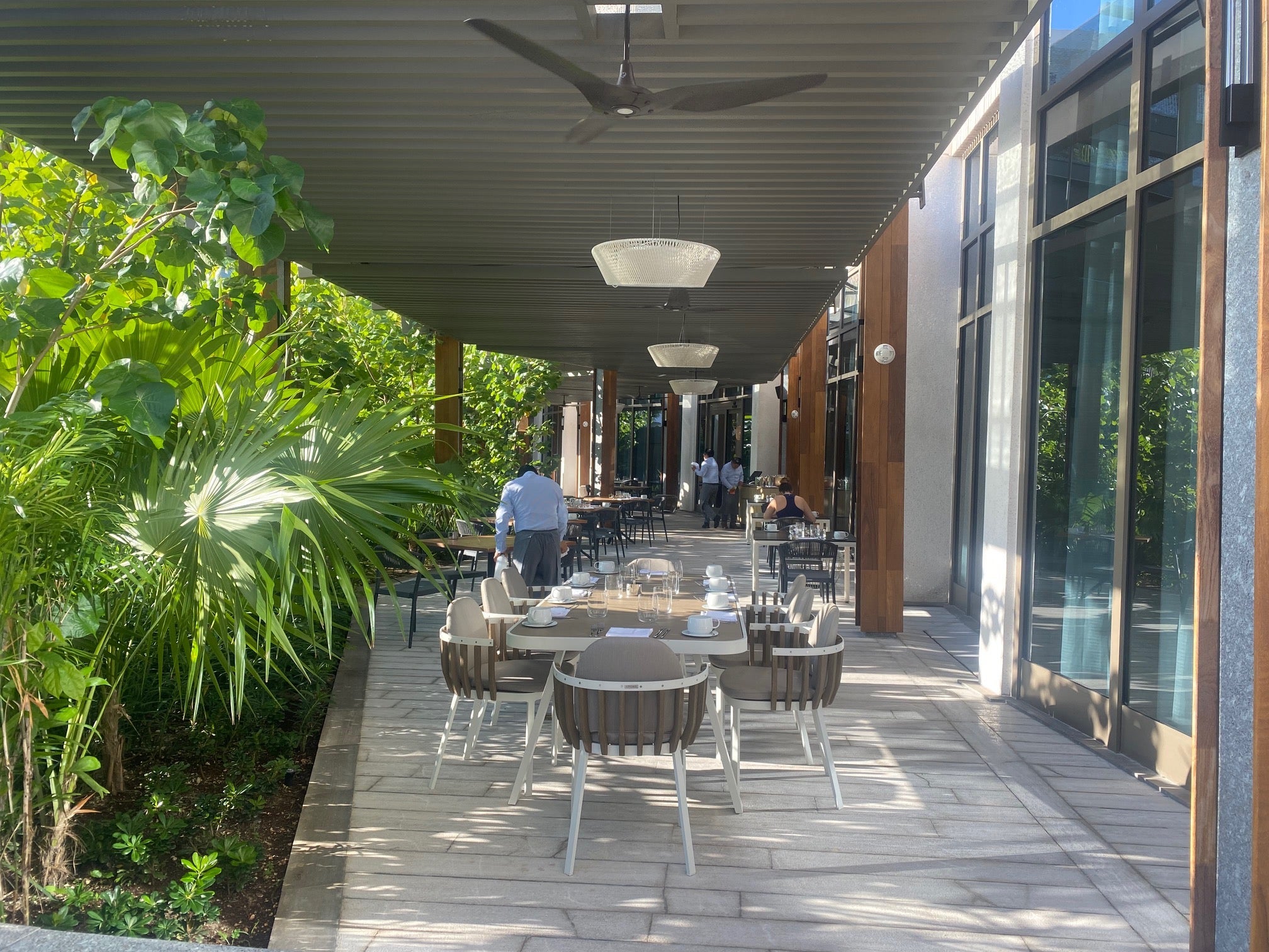 Breakfast was served à la carte in the brasserie-style Chaya. With polished gray marble tiles, black-and-white furnishings and a dramatic white sculpture in the entrance, there was a sultry vibe. During my stay, most guests dined under swirling fans on the outside terrace, which was separated from the pool area by a wall of palms and foliage.