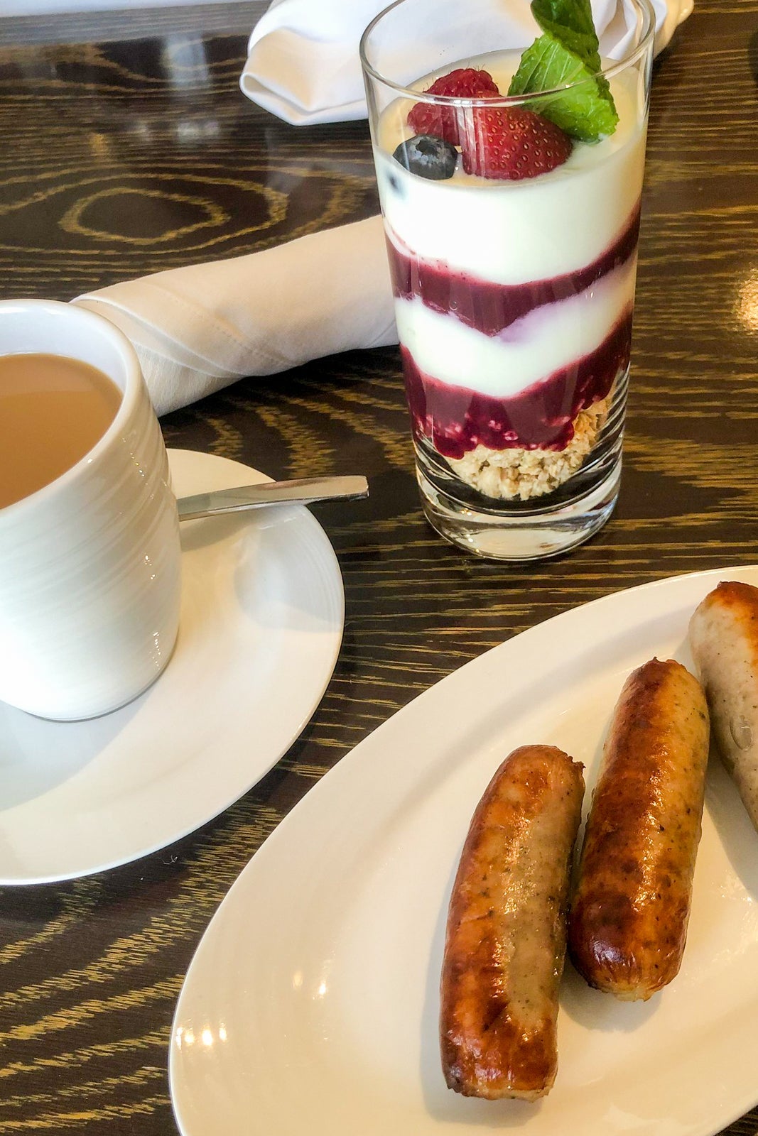 If you're famished later in the day, room service is prompt and of reasonable quality -- and served on real china with linens, a rarity in pandemic times. I ordered an admittedly weird combo of breakfast sausage, a raspberry and granola parfait with fresh berries, and coffee. (Why go to Vegas if you can't, at the very least, order an idiosyncratic room service breakfast?)