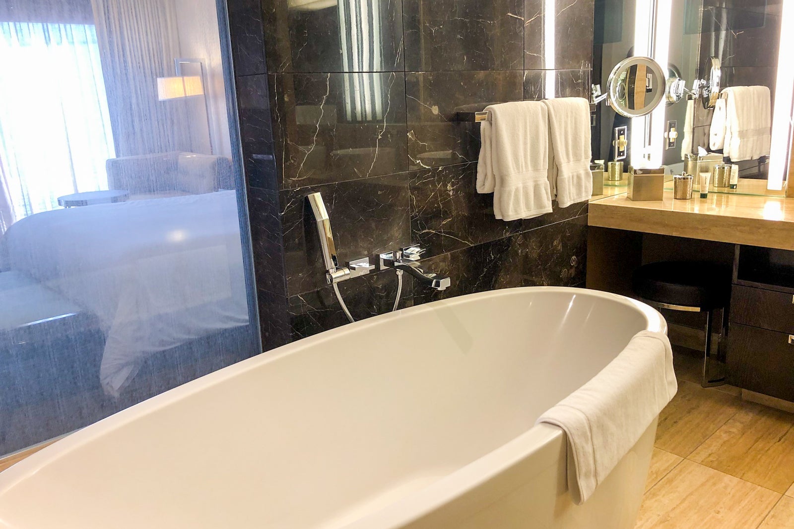 The large closet/dressing area feels like a plush walk-in closet and makes you actually want to unpack. And the marble bathroom with a large soaking tub is especially welcoming after a late night spent in less genteel parts of the Strip.