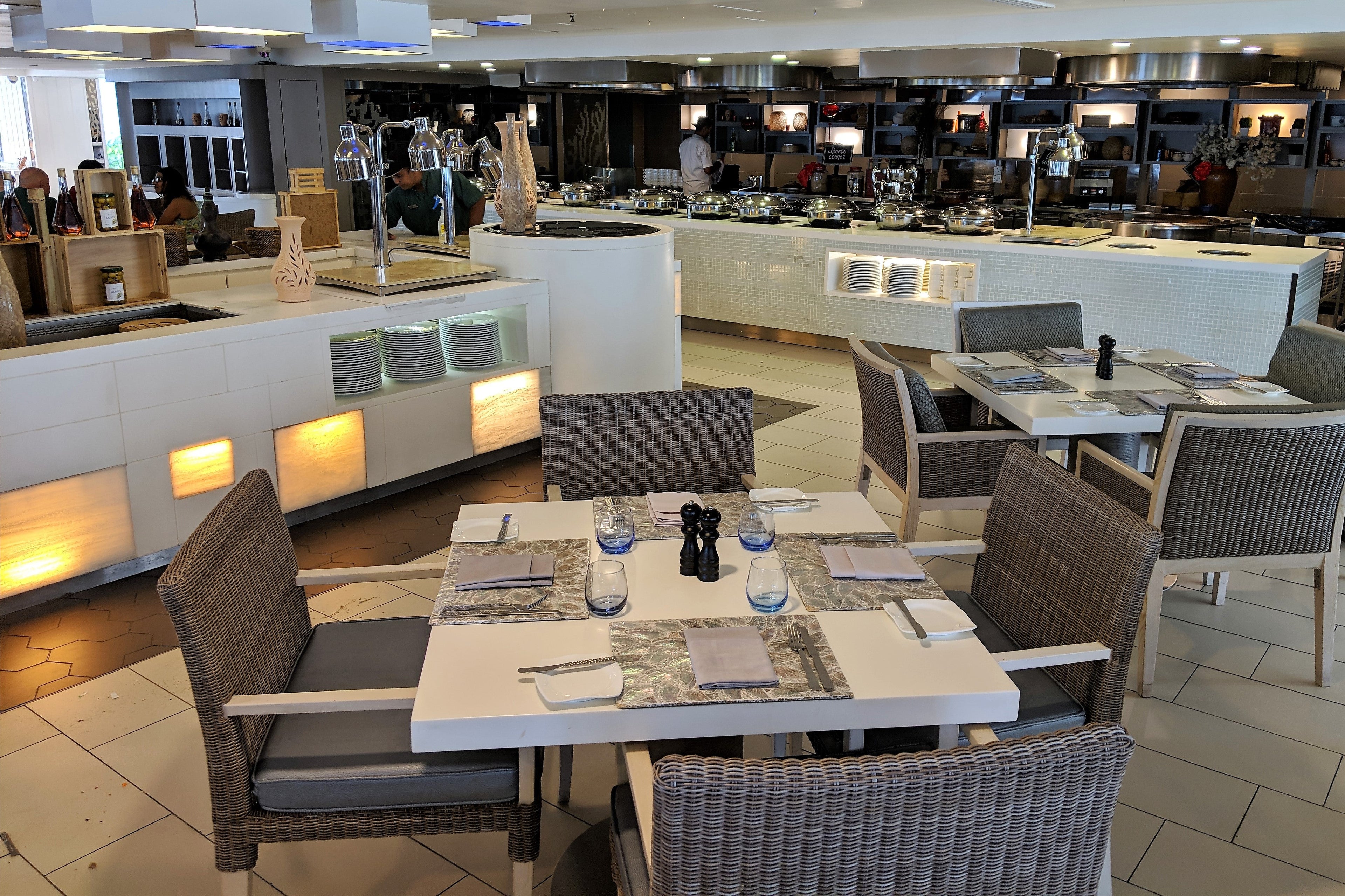 We ate dinner both nights at Breeze, as the sunset views from this restaurant were impressive and this was the most casual dinner option on site. We arrived about 45 minutes before sunset both nights and easily snagged a two-seat table by the railing.
