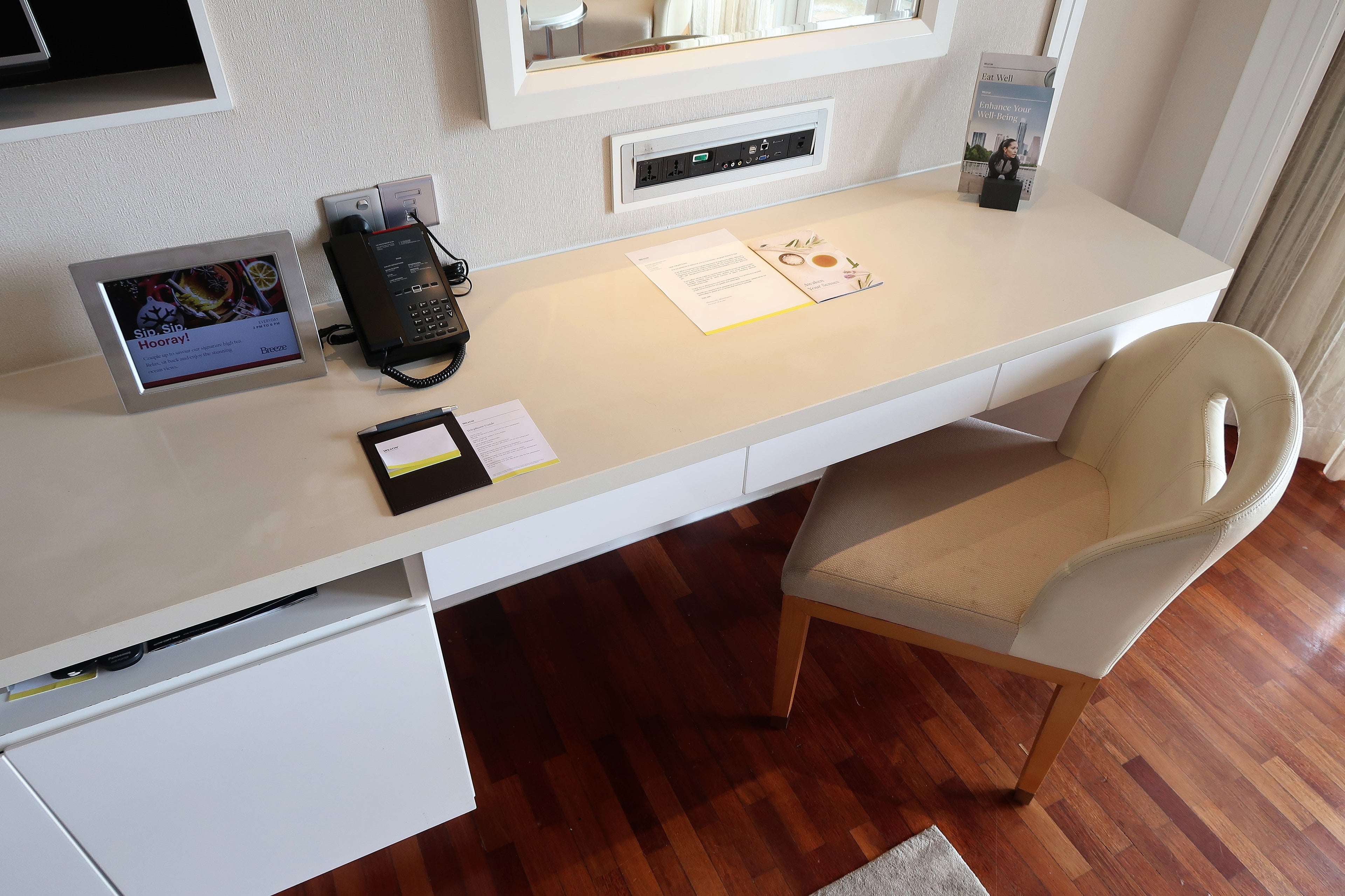 Next to the TV and minibar was a desk with a few drawers. At the desk was an entertainment panel with two universal outlets, two USB outlets, audio inputs and an HDMI outlet. Next to the desk was a trash can and a recycling bin.