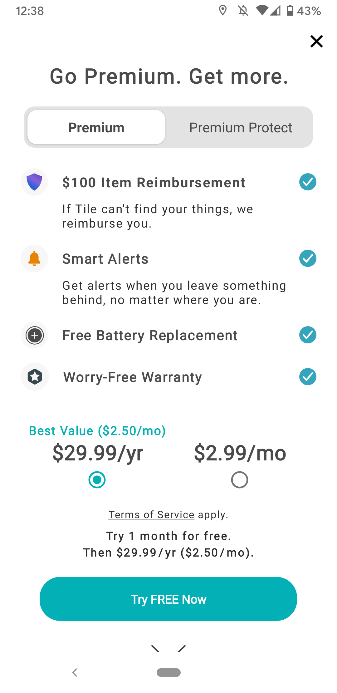 After connecting the Tile Mate to my phone, I was directed to the "Go Premium" page, where I could pay $29.99 a year for other services offered by Tile. Those included an additional warranty, Smart Alerts (a more proactive notification system) and a reimbursement program for items valued at up to $100, should I have trouble finding them using Tile.