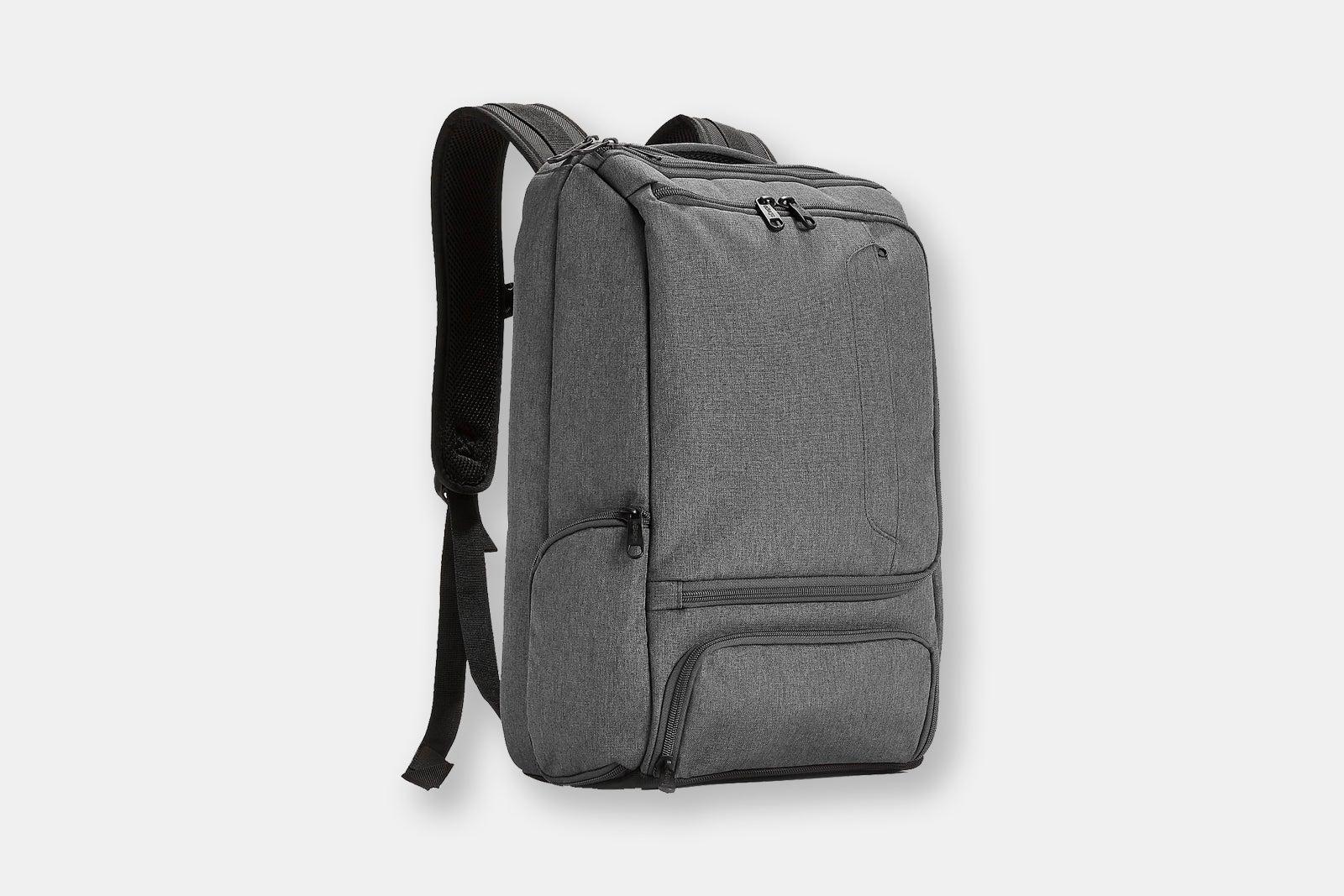 The eBags Professional Slim Laptop Backpack easily fits up to a 17" laptop as well as enough office gear to conquer all your meetings. A compact design can easily fit a change of clothes and a toiletry kit, as well as a backup pair of shoes. A pass-through strap on the back makes it easy to tote on your rolling suitcase. Select the leather-trimmed option if you need to dress your backpack up a bit. eBags doesn't have the same top-shelf guarantee as Briggs & Riley, but this bag can take a beating and still come out looking great.