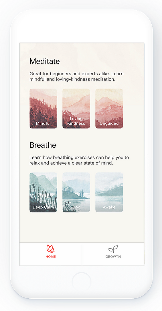 Instead of offering a million different options, the app gives users a small variety of guided meditations, chime and background customizable sessions, breathing mantras and relaxing sleep sounds. For busy moms, business travelers or anyone who just can't be bothered to dig through hundreds of different plans, just click "play" and do a five-minute breathing session or a quick sleep meditation before bed, on a plane or during a break from work.