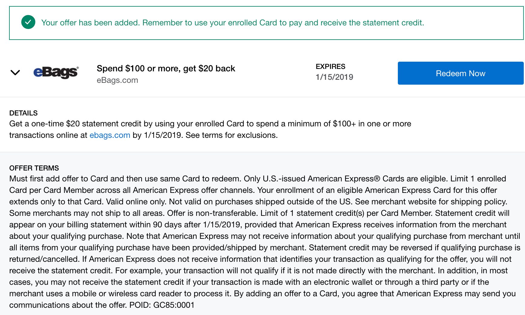 11/22/2018 UPDATE: Amex is offering a targeted $20 statement credit for $100+ purchases from eBags, which is an additional 20% stackable discount on top of the DEALS coupon code and the shopping portal bonus, meaning you could triple-dip on that new piece of luggage you've been drooling over.