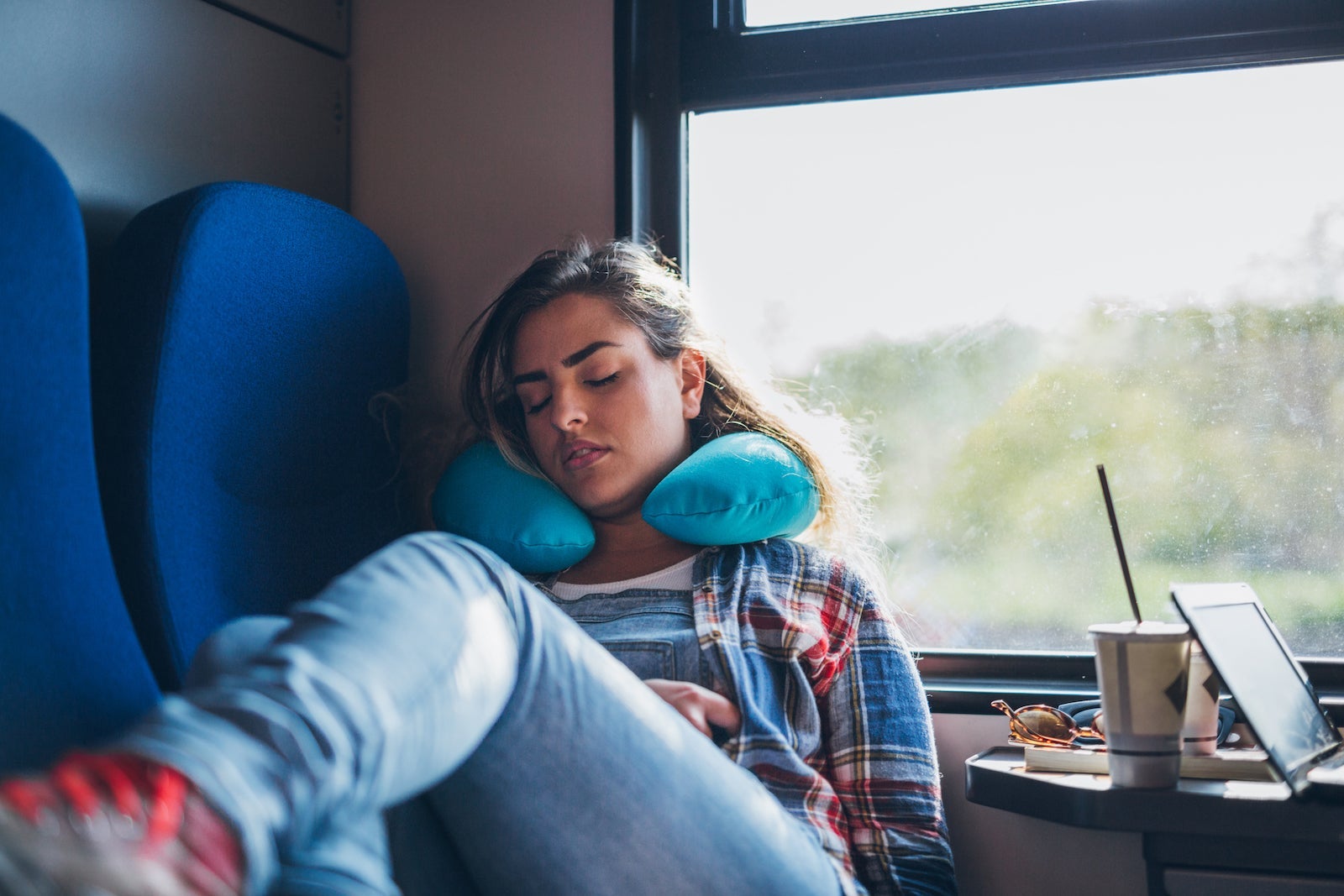 Seats don't recline much and can cause you to fall forward when you sleep, waking you frequently. Because of this, the pillow's back should be thinner, so it doesn't push your head too far forward, according to Alviene.