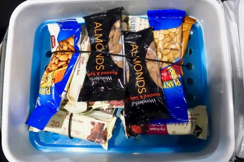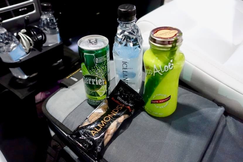 Although not as fancy as the one on Emirates' A380, there was a bar onboard. Okay, maybe it's not exactly a bar, but there was a cooler packed with complimentary snacks and beverages located between the two seats in the middle row.